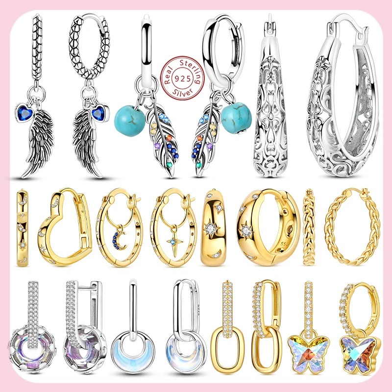 New 925 Sterling Silver Hoops Earrings Star Moon Sun Bow Feather Wing Stud Hoops Earrings For Women Girl Party Fashion Jewelry