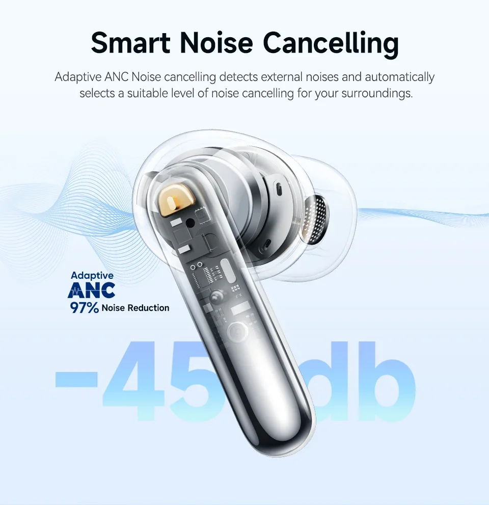 QCY Melobuds N50 ANC Bluetooth 5.4 Wireless Earphones AI HD Call 4 Modes Active Noise Cancellation Earbuds Multipoint ConnectionAdaptive Active Noise Cancellation: Immerse yourself in your world without distractions.QCY Melobuds N50 noise cancelling earphones come equipped with adaptive active noise cancellation (ANC) that intelligently adapts to your surroundings, ensuring that ambient noise is effectively eliminated.