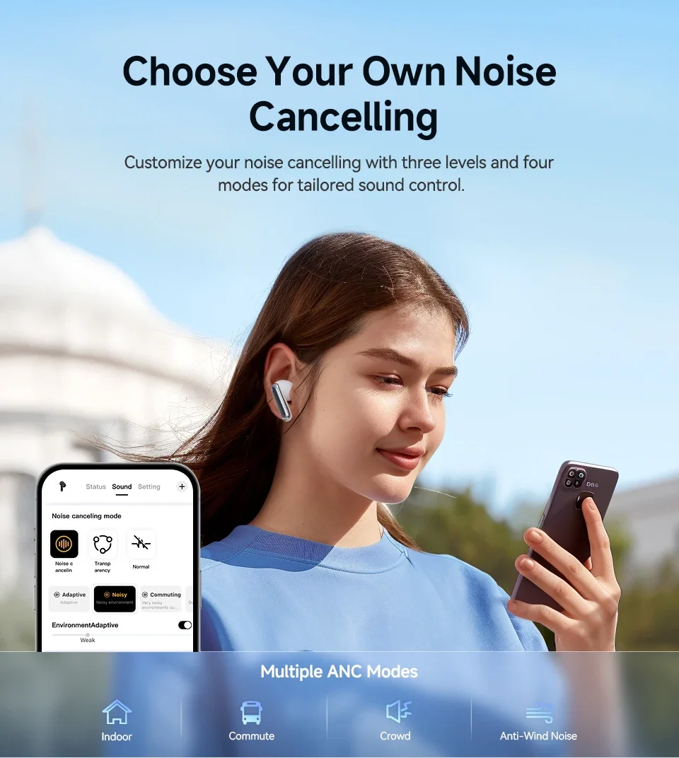 Multiple ANC Mode Noise Cancelling: Select from 4 noise cancelling modes: transport, anti-wind Noise, outdoor and indoor mode.Customize your noise cancelling with three levels and four modes for tailored sound control.