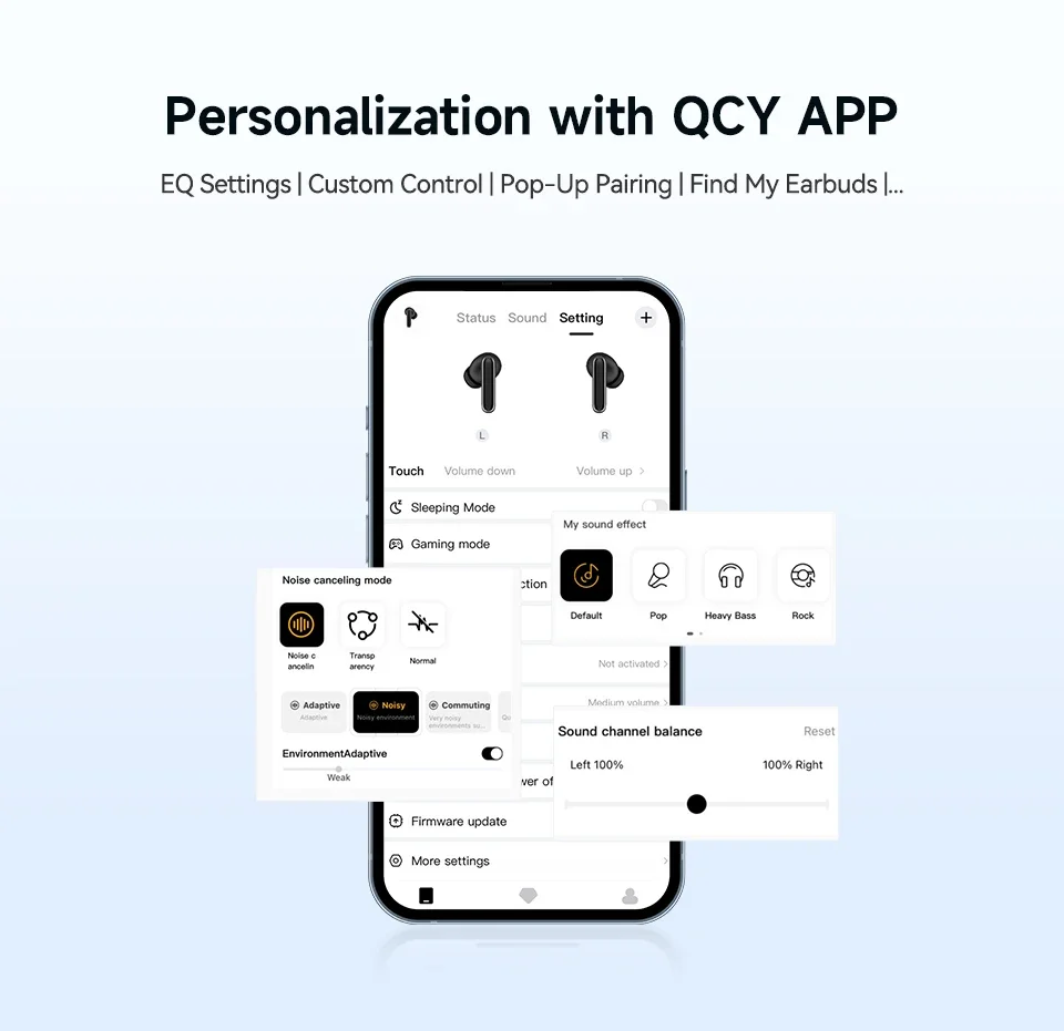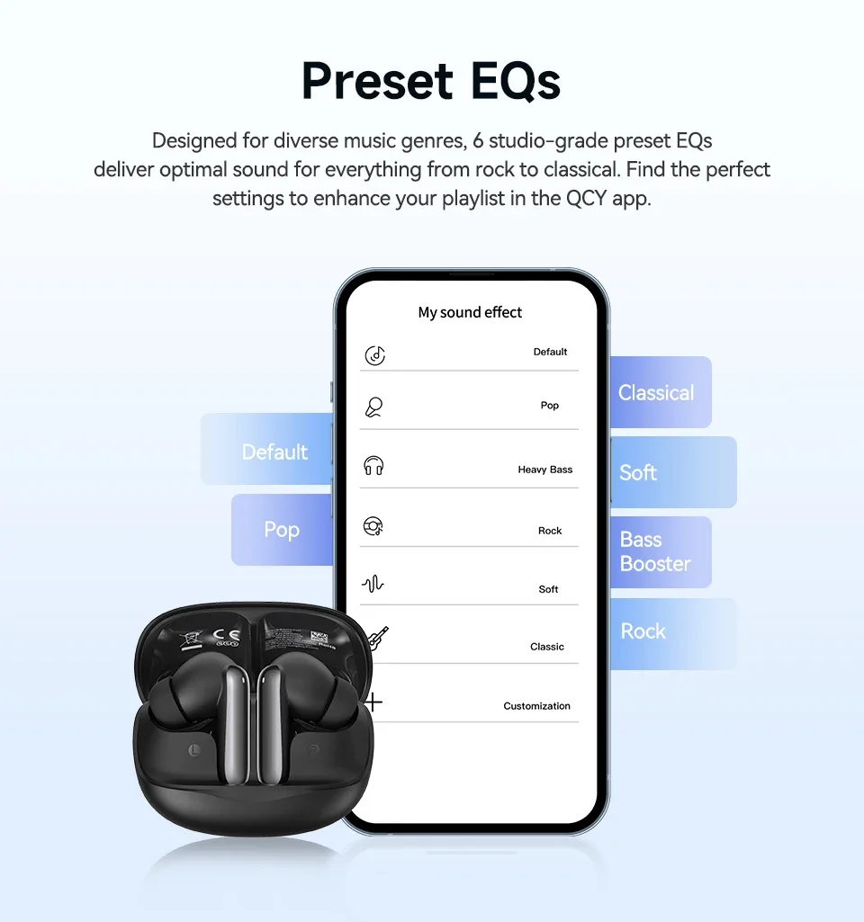 Designed for diverse music genres, 6 studio-grade preset EQs deliver optimal sound for everything from rock to classical.Find the perfect settings to enhance your playlist in the QCY app.