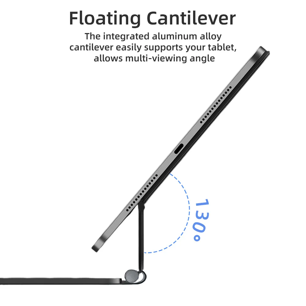 * Magnetic floating design – designed for the ipad , the keyboard incorporates a strong magnetic fixation that ensures safety and stability.With an ergonomically adjustable angle, you can tilt your ipad to the level you prefer.Additionally, the magnetic closing and opening system activates the ipad’s auto sleep and wake functions.
