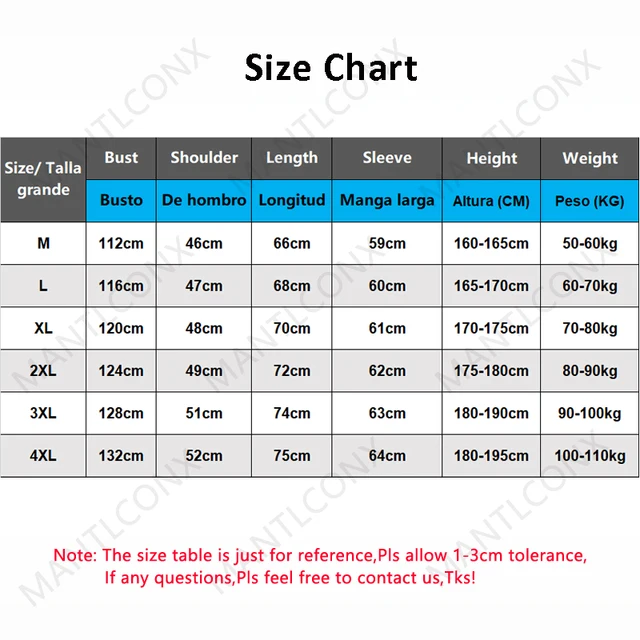 | Asian Size | L, XL, XXL, XXXL |