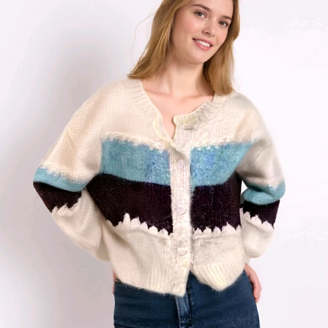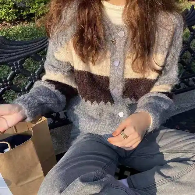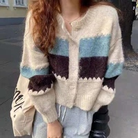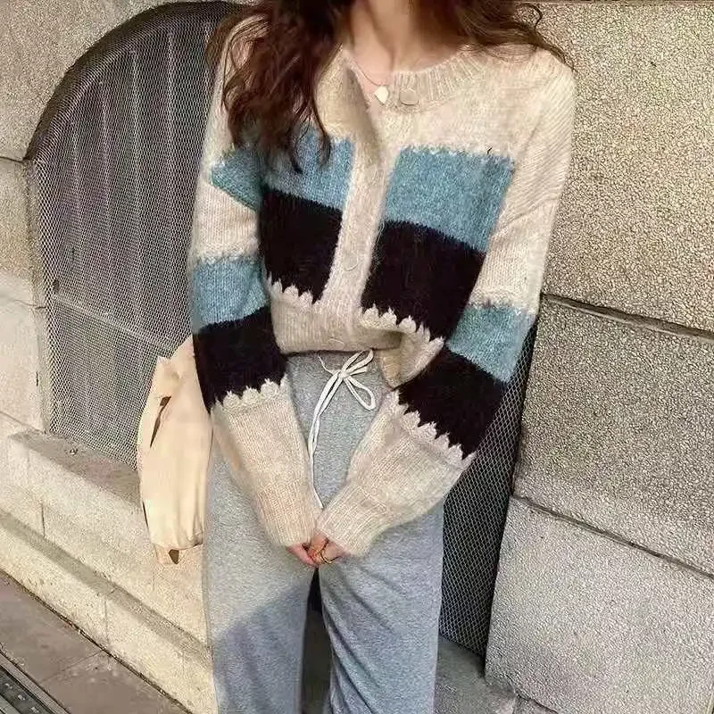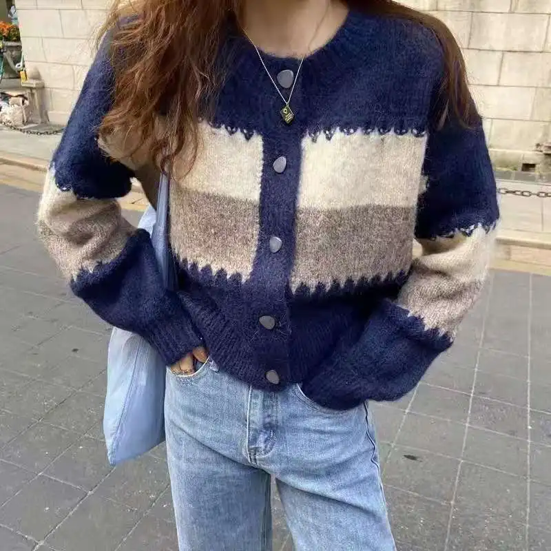 New Cardigan Casual Loose Korean Sweater Women Short Jacket O Neck Autumn New Retro Striped Knitted Outerwear
