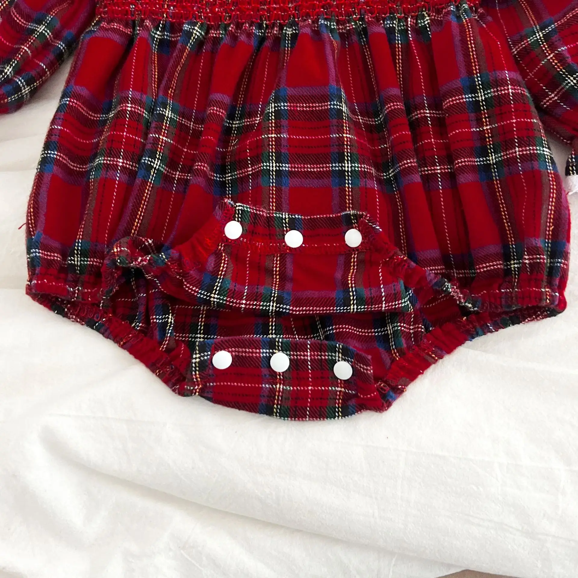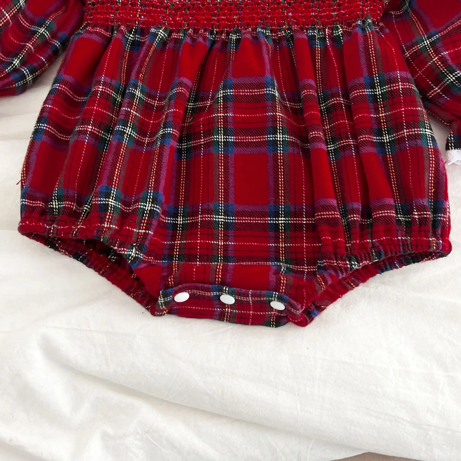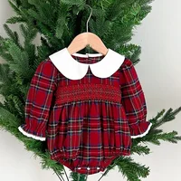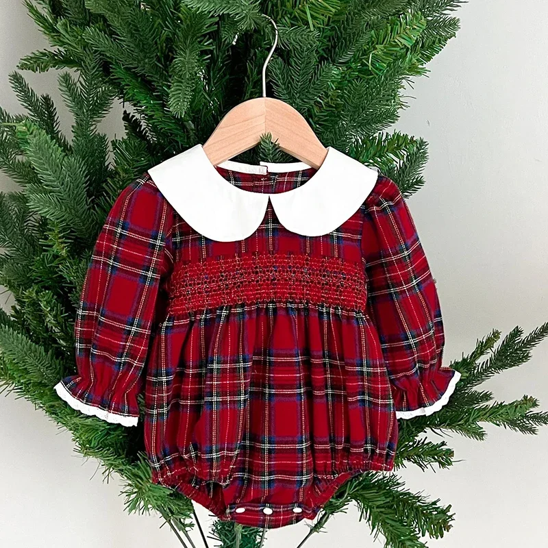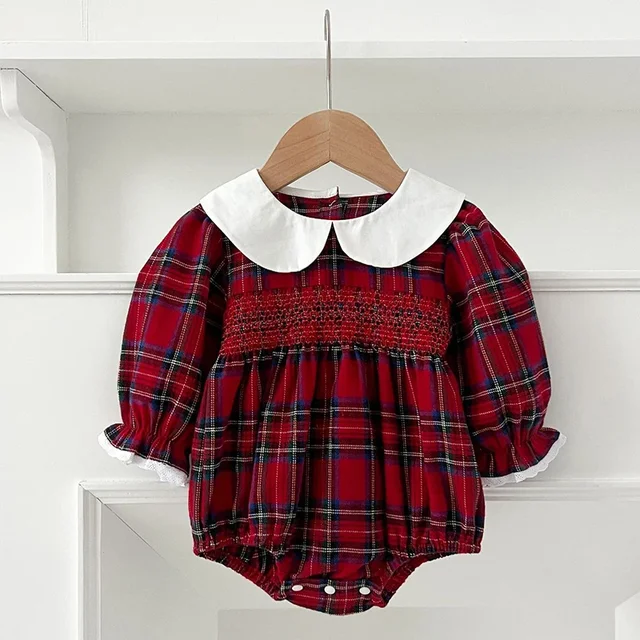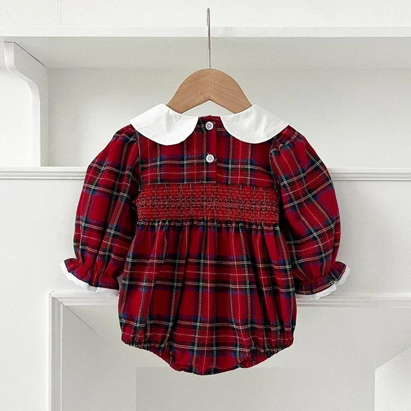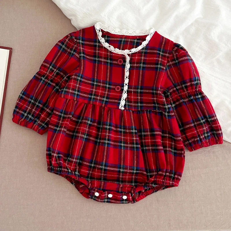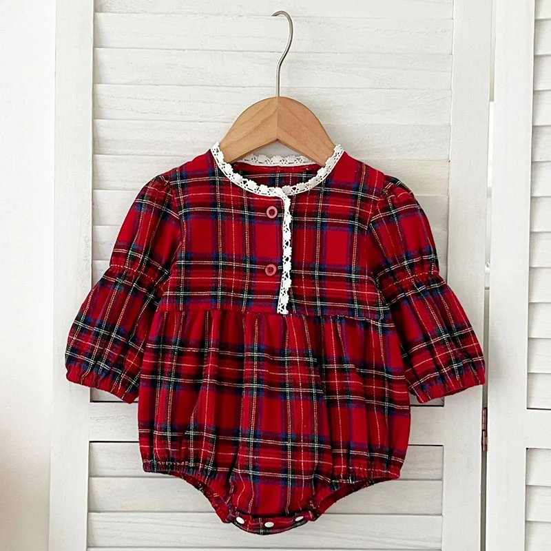 New Christmas Toddler Baby Girl Romper Long Sleeves Grid Romper Autumn Newborn 0-24M Splicing Infant Baby Girls Red Jumpsuit