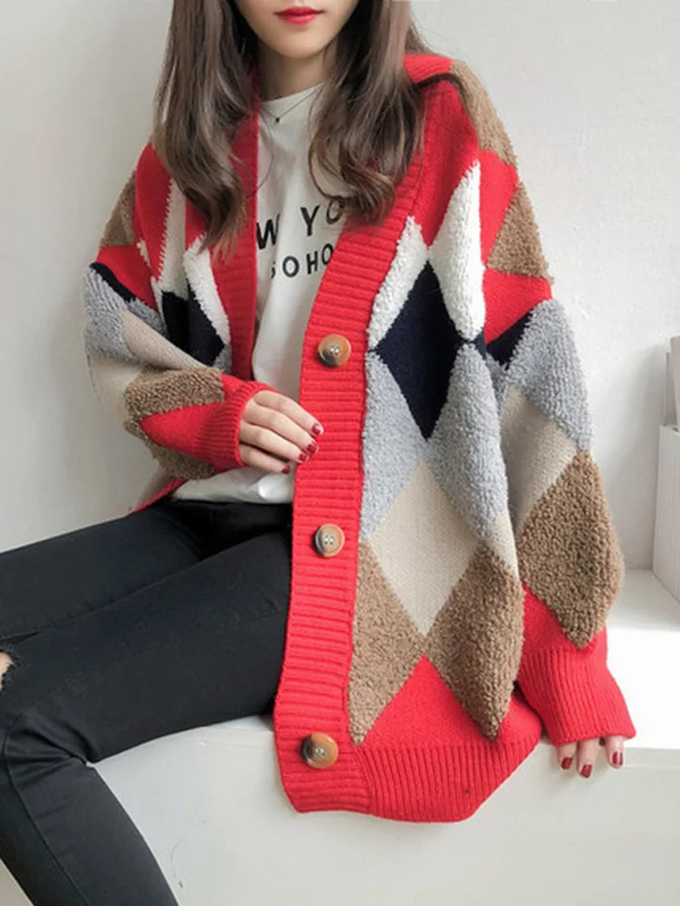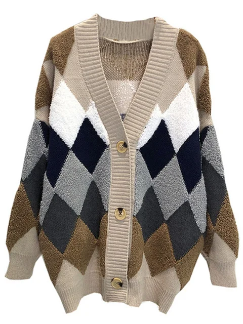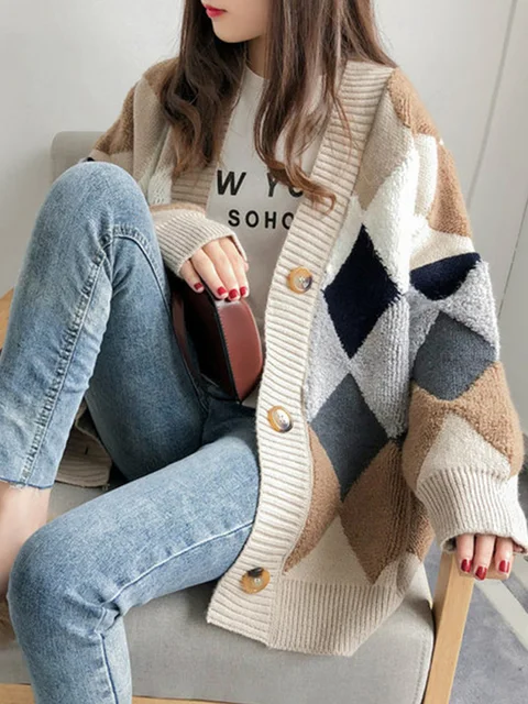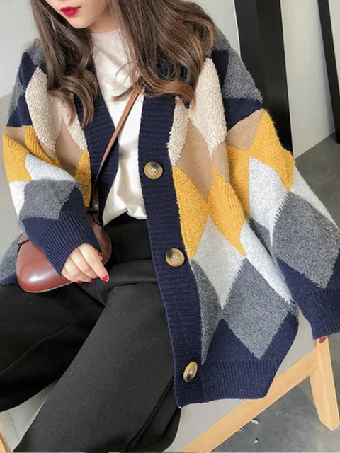 New Fashion Autumn Winter Geometric Printing Knitted Cardigan Coat Women Casual Loose Long Sleeve Sweater Button Winter Clothes