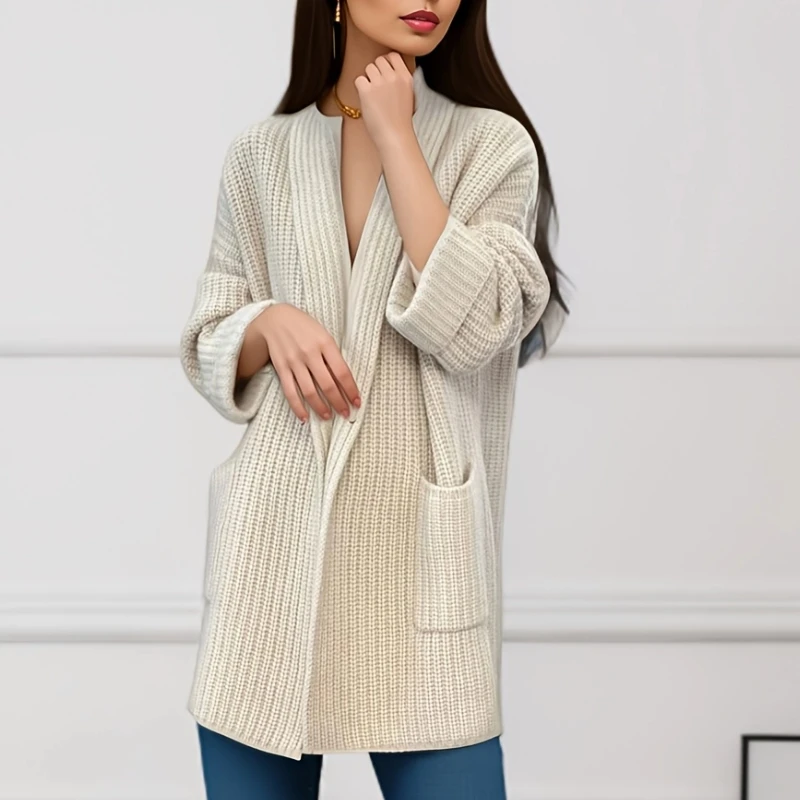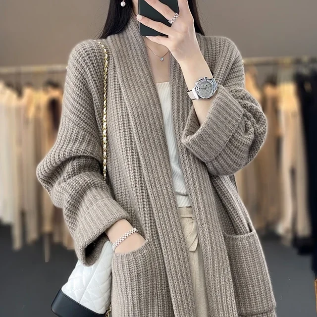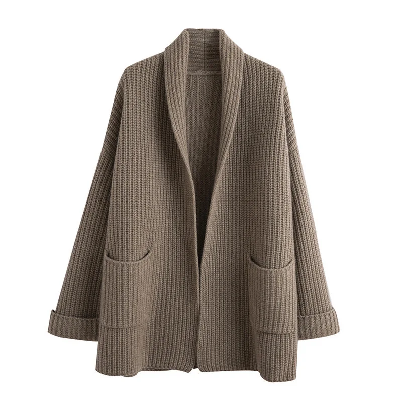New Fashion Women’s Knitted Solid Color Sweater Jacket with Pocket Lapel Cardigan Long Sleeve Casual