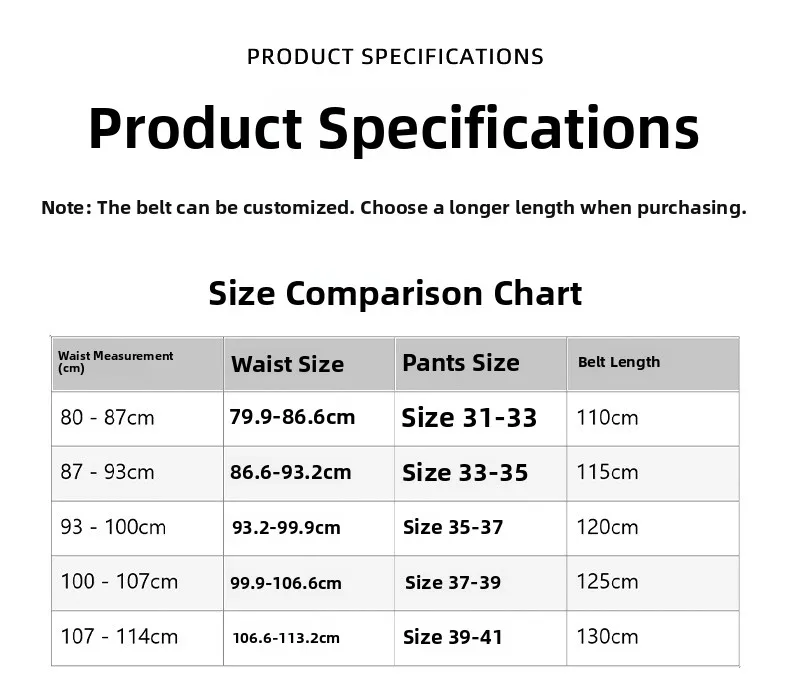 Available in sizes from 110-130, this belt caters to a wide range of waist sizes, ensuring a comfortable fit for everyone.