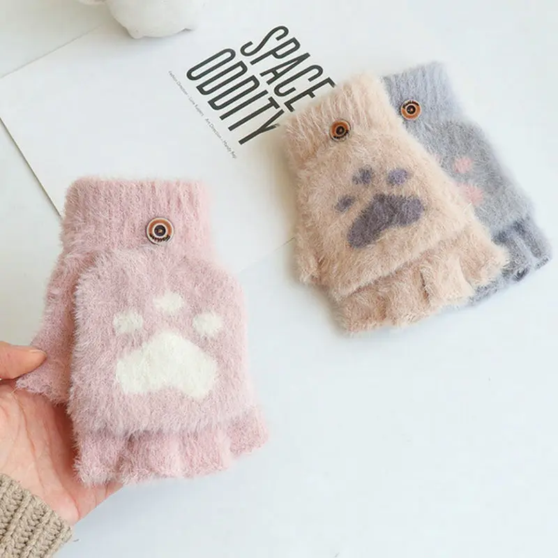 New Kawaii Women Warm Cat Gloves Fashion Girls Cat Claw Paw Plush Mittens Soft Plush Short Fingerless