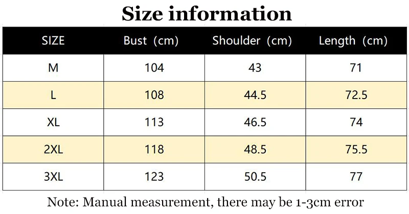 | size_info | {"sizeInfoList":[{"length":{"cm":"M","inch":"M"},"size":"M","vid":-30},{"length":{"cm":"L","inch":"L"},"size":"L","vid":-31},{"length":{"cm":"XL","inch":"XL"},"size":"XL","vid":-32},{"length":{"cm":"2XL","inch":"2XL"},"size":"2XL","vid":-33},{"length":{"cm":"3XL","inch":"3XL"},"size":"3XL","vid":-34}]} |