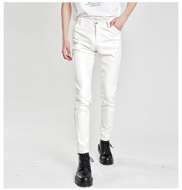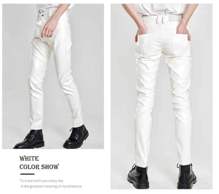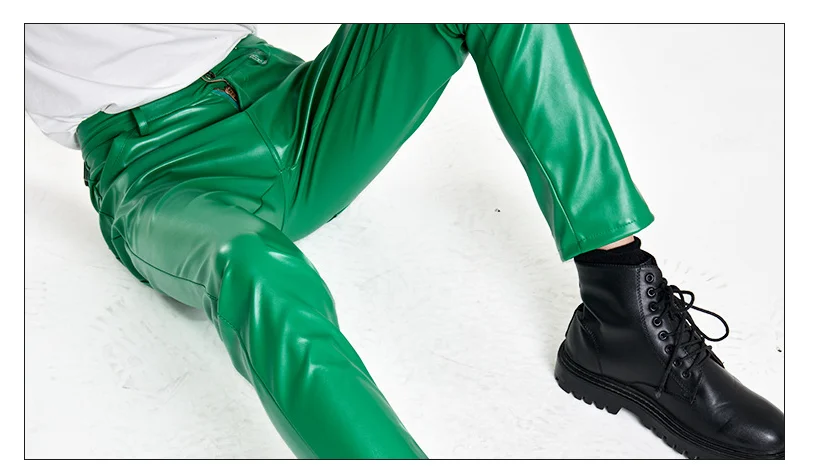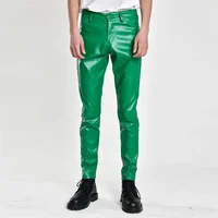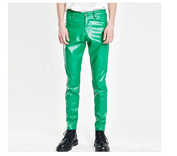 New Men Solid Color Slim Fit Faux Leather Pants Green / White / Black Homme Bar KTV High Street Biker