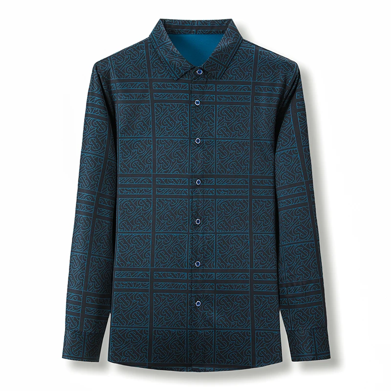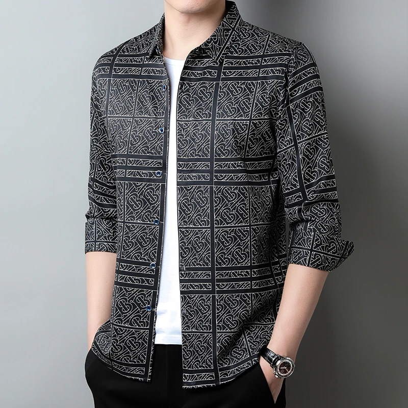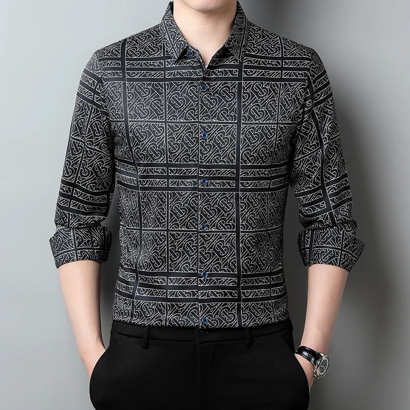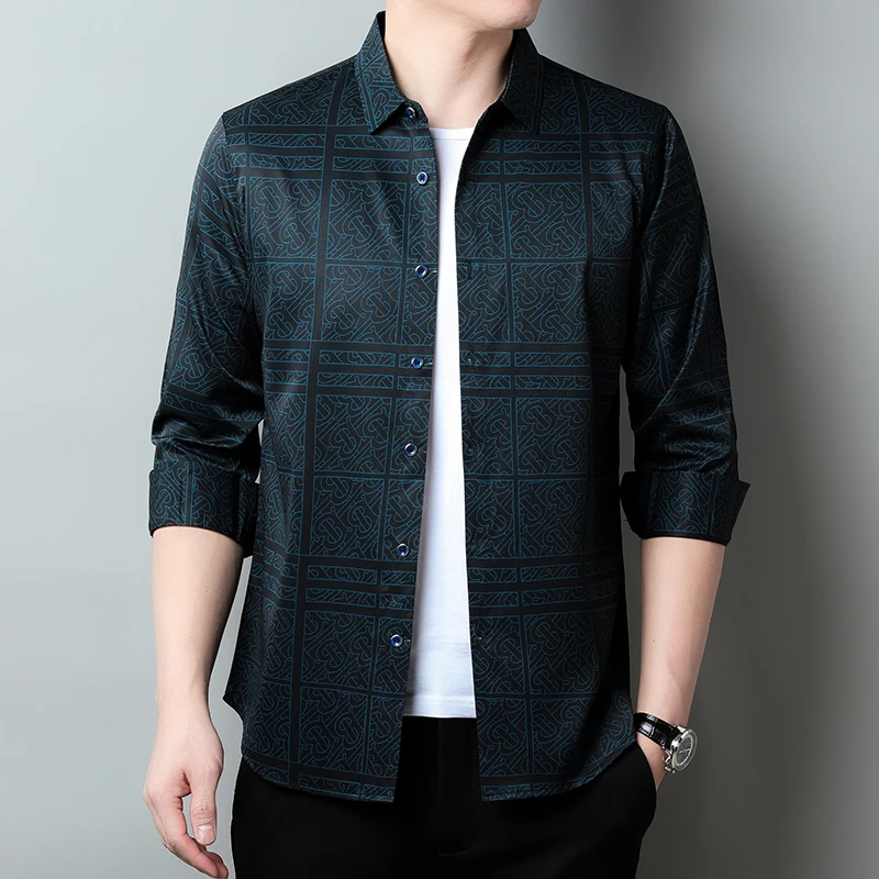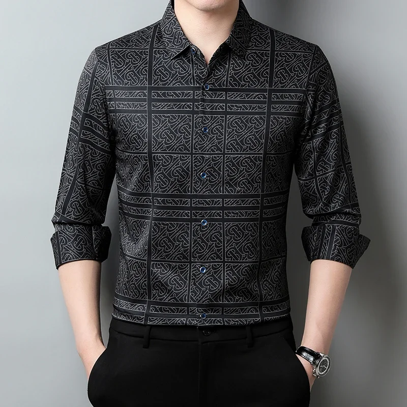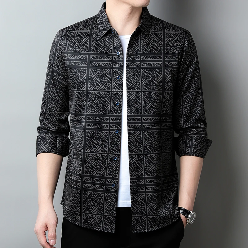 New Men's Casual Printed Long Sleeved Lapel Shirt for Spring and Autumn Fashion Comfortable Wrinkle Free Top Without Ironing