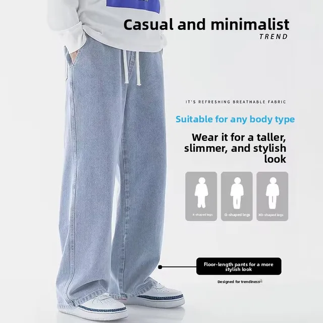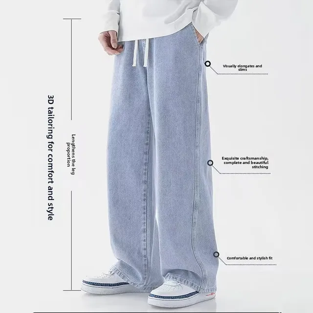 New Men's Wide Leg Loose Spor Jeans Trendy Korean Sle Elastic Waist Straight Long Pants Casual Spring Autumn Jeans