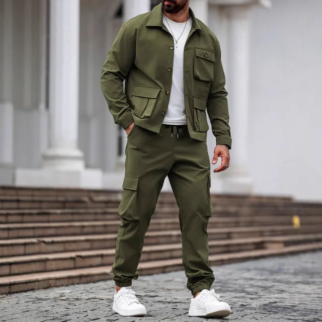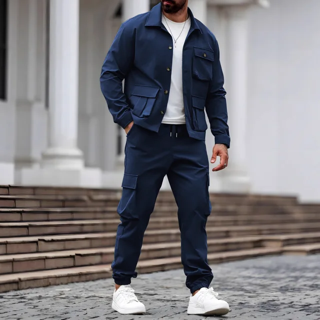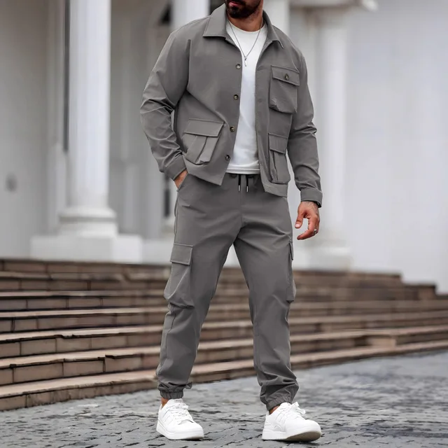 New men's fashionable casual workwear multi-pocket long-sleeved jacket and trousers in solid color set