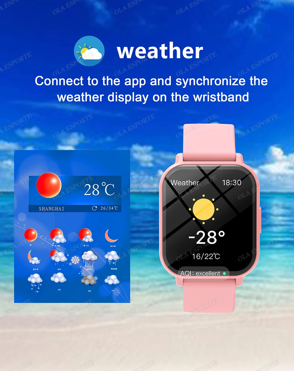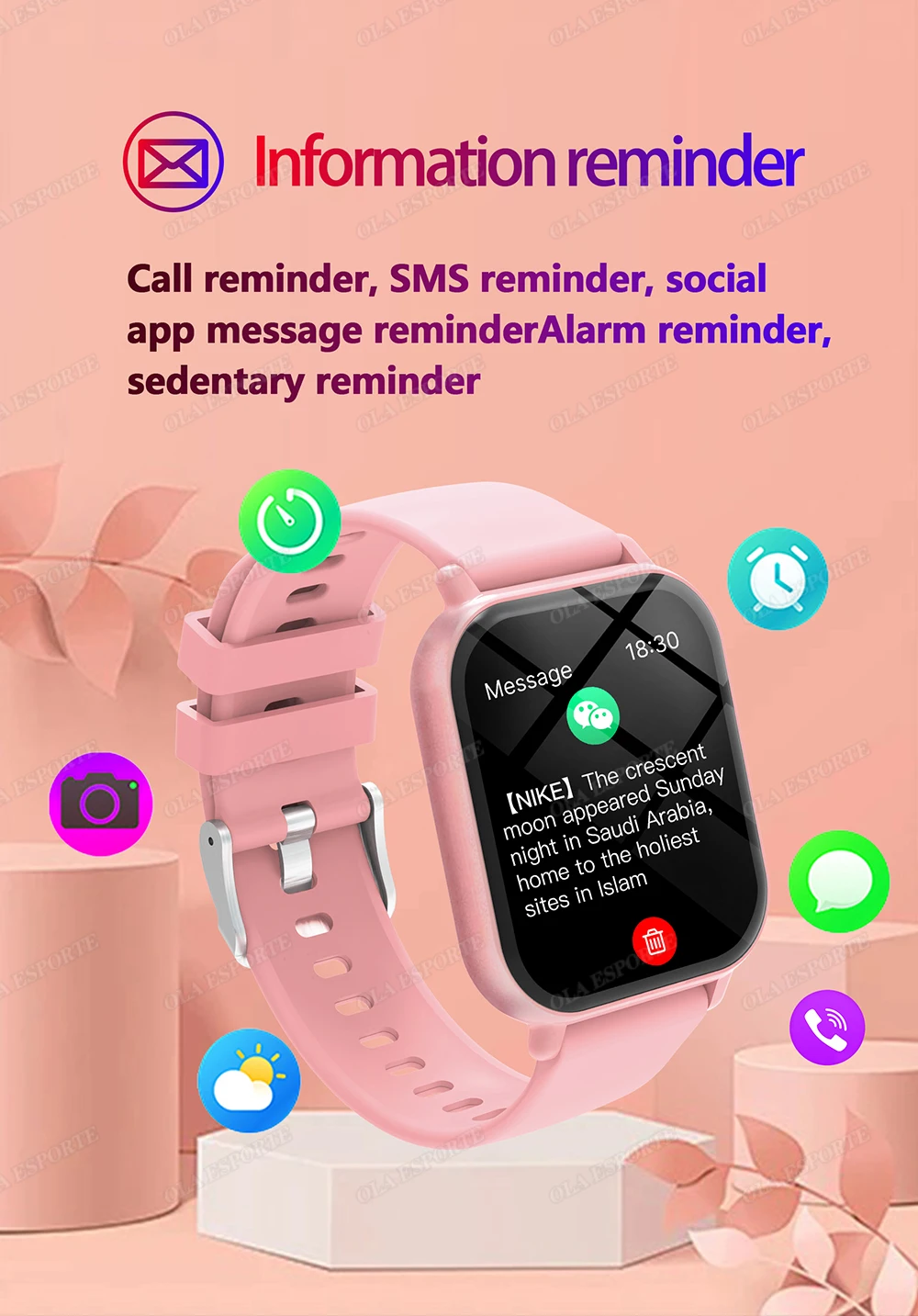 • Notification: Synchronous incoming message notification from Notification Center on your phone (SMS,Facebook,INS,Twitter,Yeasmaie,Whats app, etc.), incoming call reminder.