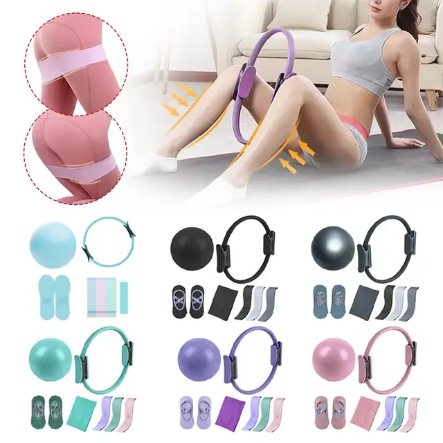 Includes a Pilates ring, resistance bands, silicone stretch bands, yoga socks, and fitness balls, providing a comprehensive set for stretching, toning, and home workouts.