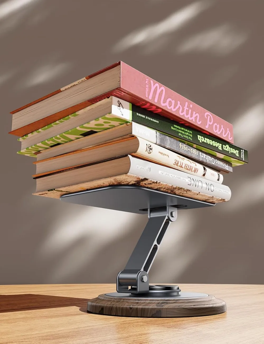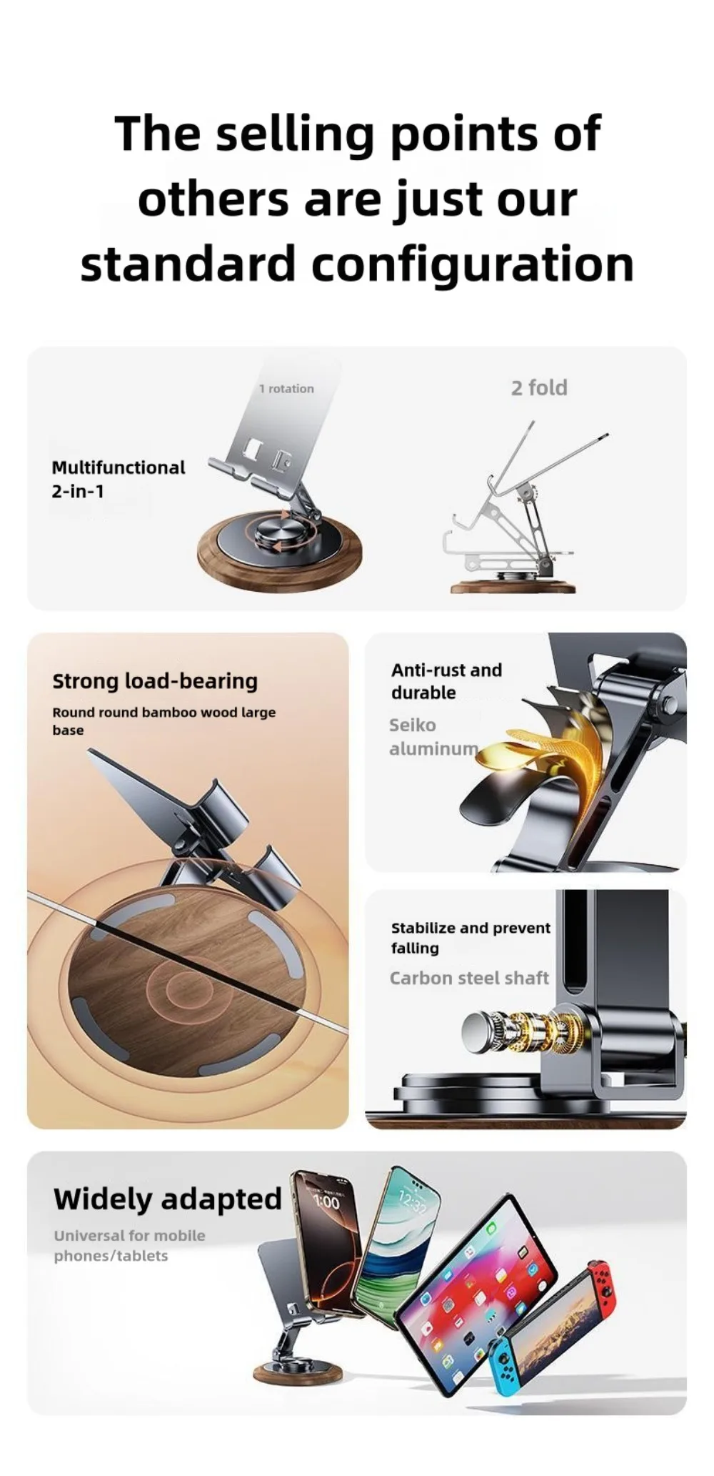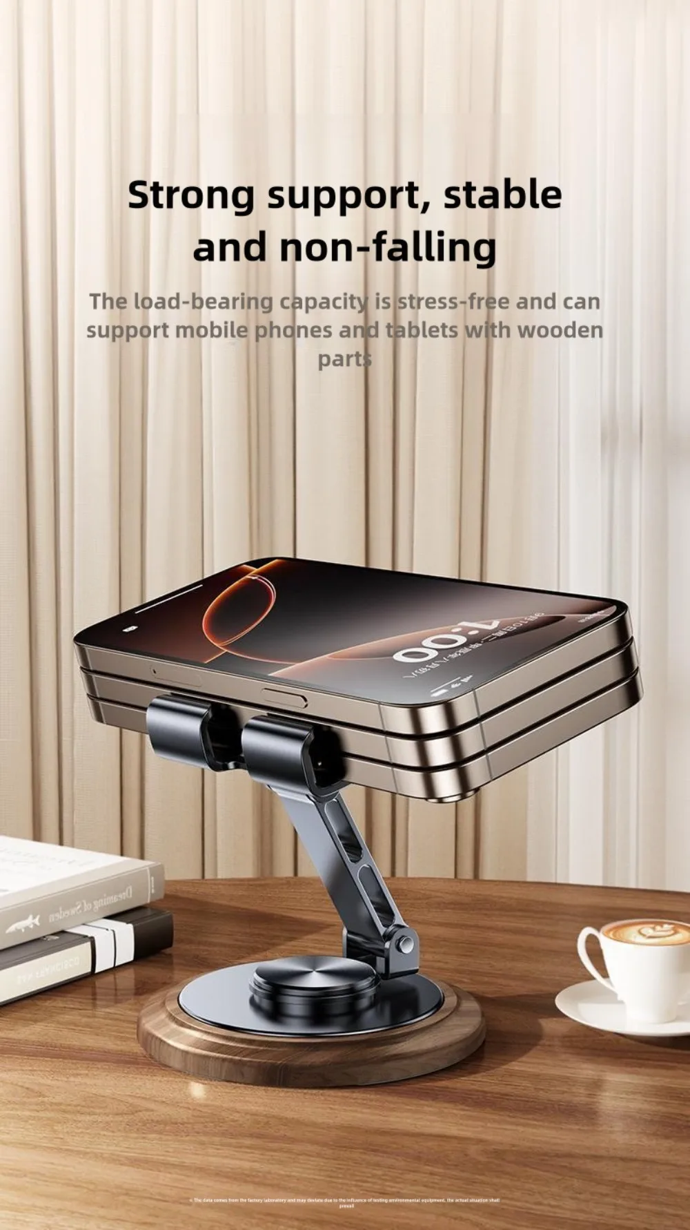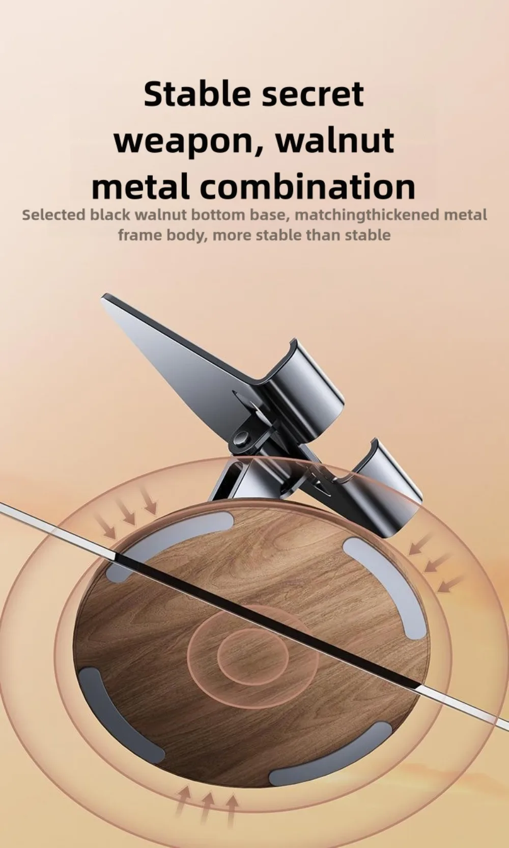 – Elegant Walnut Wood Base: Featuring a weighted base made from genuine walnut wood, this stand combines functionality with a touch of elegance. The natural wood finish adds a sophisticated look to any desktop or workspace.