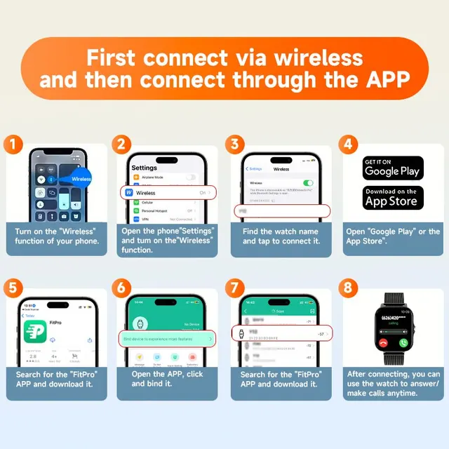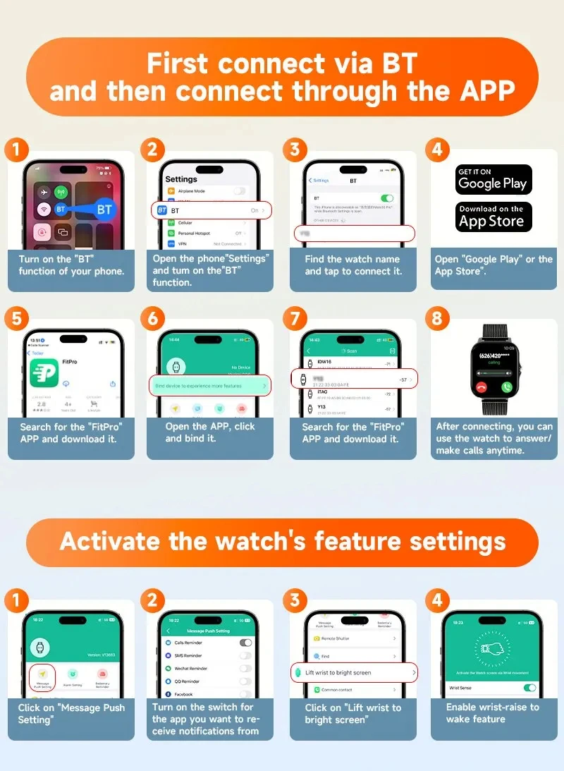 After receiving the watch, please charge it first, because after a long time of logistics, the watch will be low on power. Before using, please scan the QR code on the manual to download the APP and use the APP to connect with the watch.