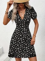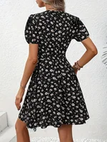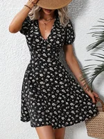 New Elegent Women’s Summer Floral Printed Dress Casual Vacation V Neck Puff Sleeve Dresses
