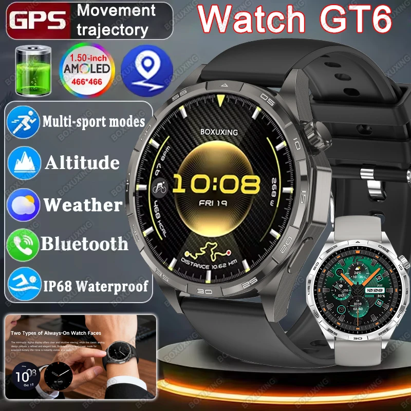 New Watch GT6 Smart Watch Men HD AMOLED Screen GPS Track Always Show Time Heart Rate Bluetooth Call Waterproof Sports Smartwatch