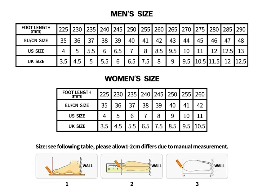 1、Colors on your phone or computer monitor may differ slightly from actual product colors,It depend on your monitor settings. 2、Our shoes are inChinese size. please measure your feet length , thenaccording to your feet length to chose size .if your feet is a little fat, please chose 1 size bigger.if you are confused, just contact with us . 3、How to chose the correct size ?