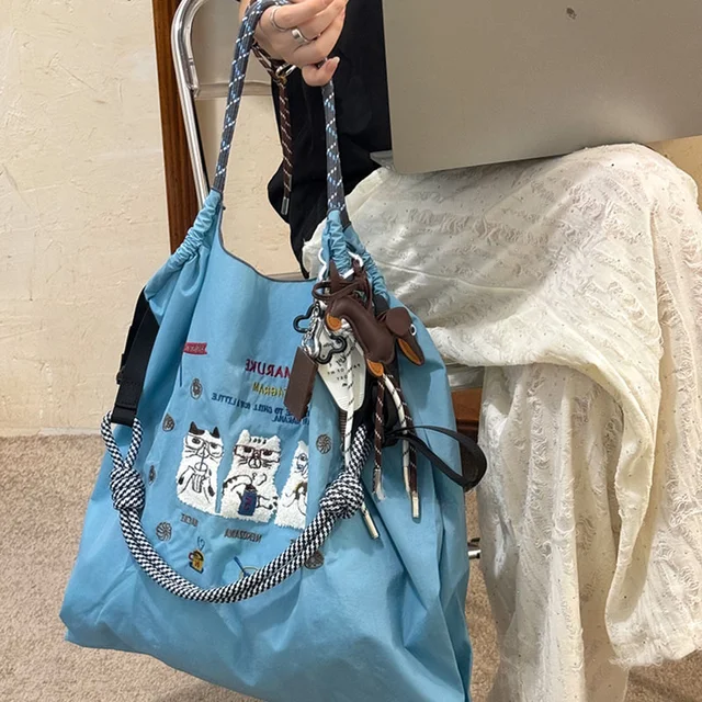New women's crossbody bag Nylon shopping bag Cat embroidery lightweight Tote bag Folding storage suitable for commuting travel l