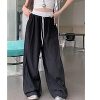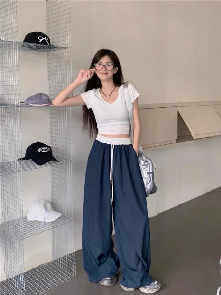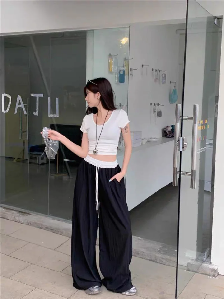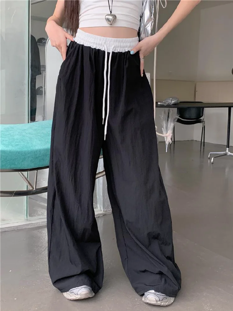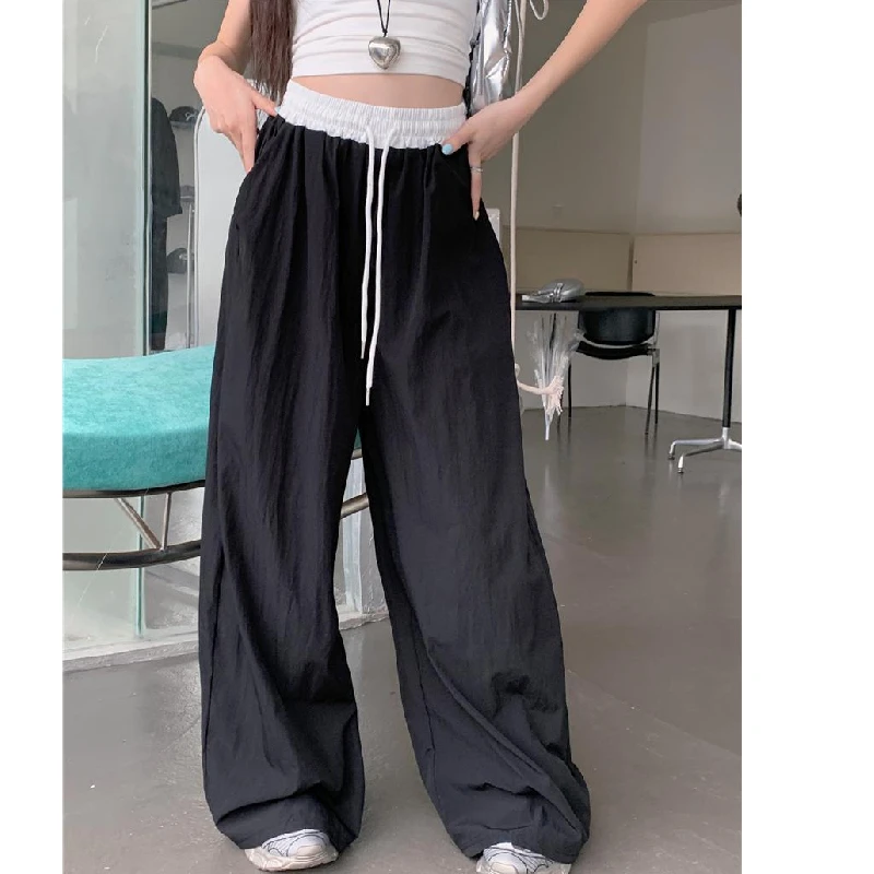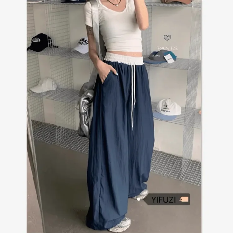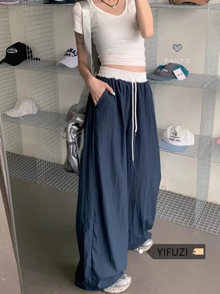 New Women's Wide Leg Elastic Waist Casual Pants Summer Texture Drapey Straight Floor-Length Pants Versatile Trendy