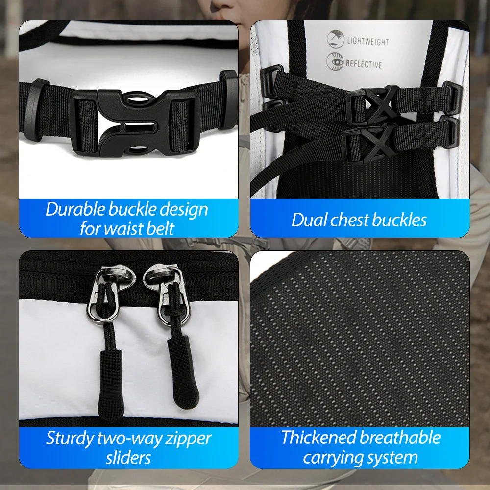 4.Safety First: Enhanced with reflective detailing, our hiking vest pack improves visibility in low-light conditions, making it safer for night-time adventures. This added safety feature ensures you’re seen by others, whether you’re on a late-night run or early morning trek.