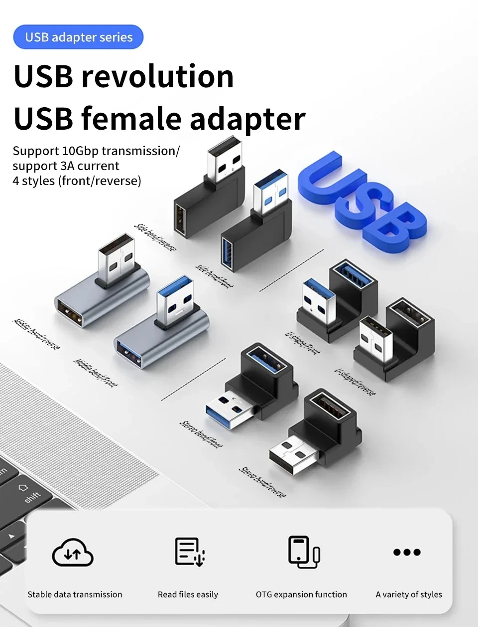 Used for changing usb port direction. Best solution for cable connection in narrow place, prevent cable bending. It also protect original usb port of your devices as well.