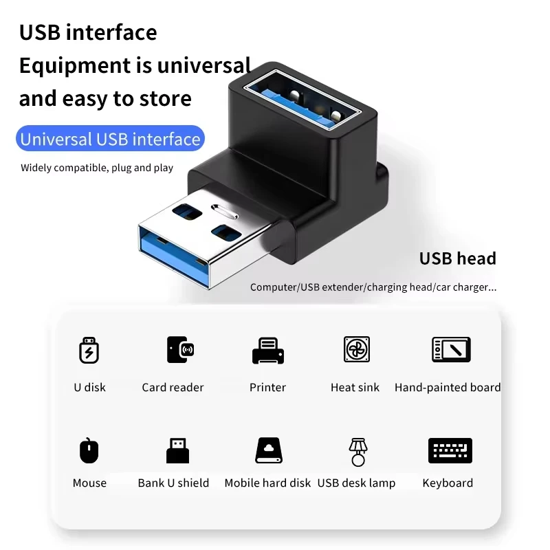 Used for changing usb port direction. Best solution for cable connection in narrow place, prevent cable bending. It also protect original usb port of your devices as well.