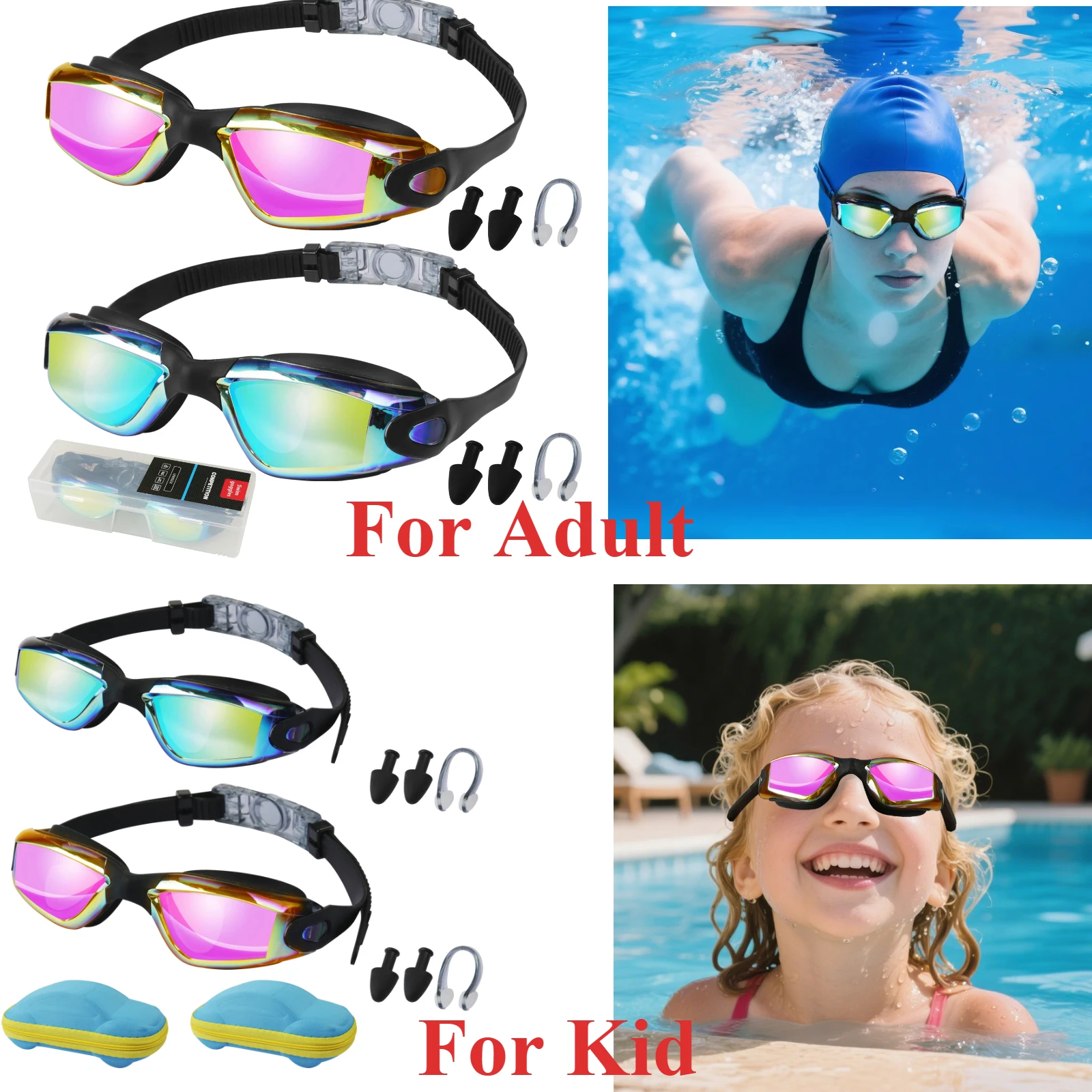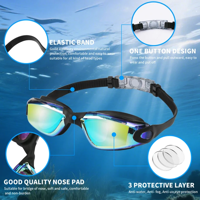 NO FOG: Swimming goggles the lenses are coated with the newest advanced anti-fog, which can prevent fogging to the maximum extent, does not hurt the eyes, and can provide you with clear and long-distance vision when swimming.