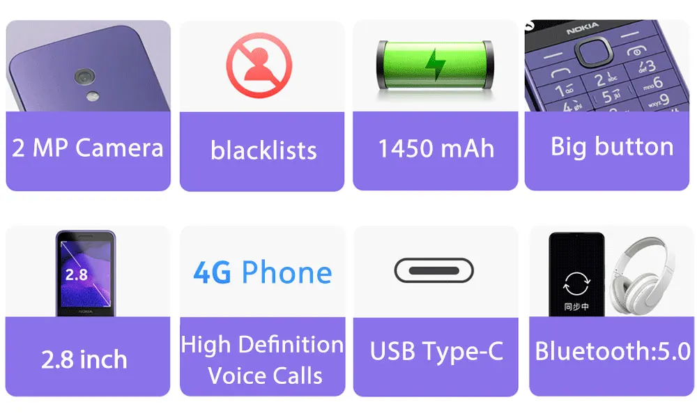 2MP Camera / Metal Body / 1450mAh Battery / Big button / Eco-friendly / 2.8inch screen / High Definition Voice Calls / and other functions