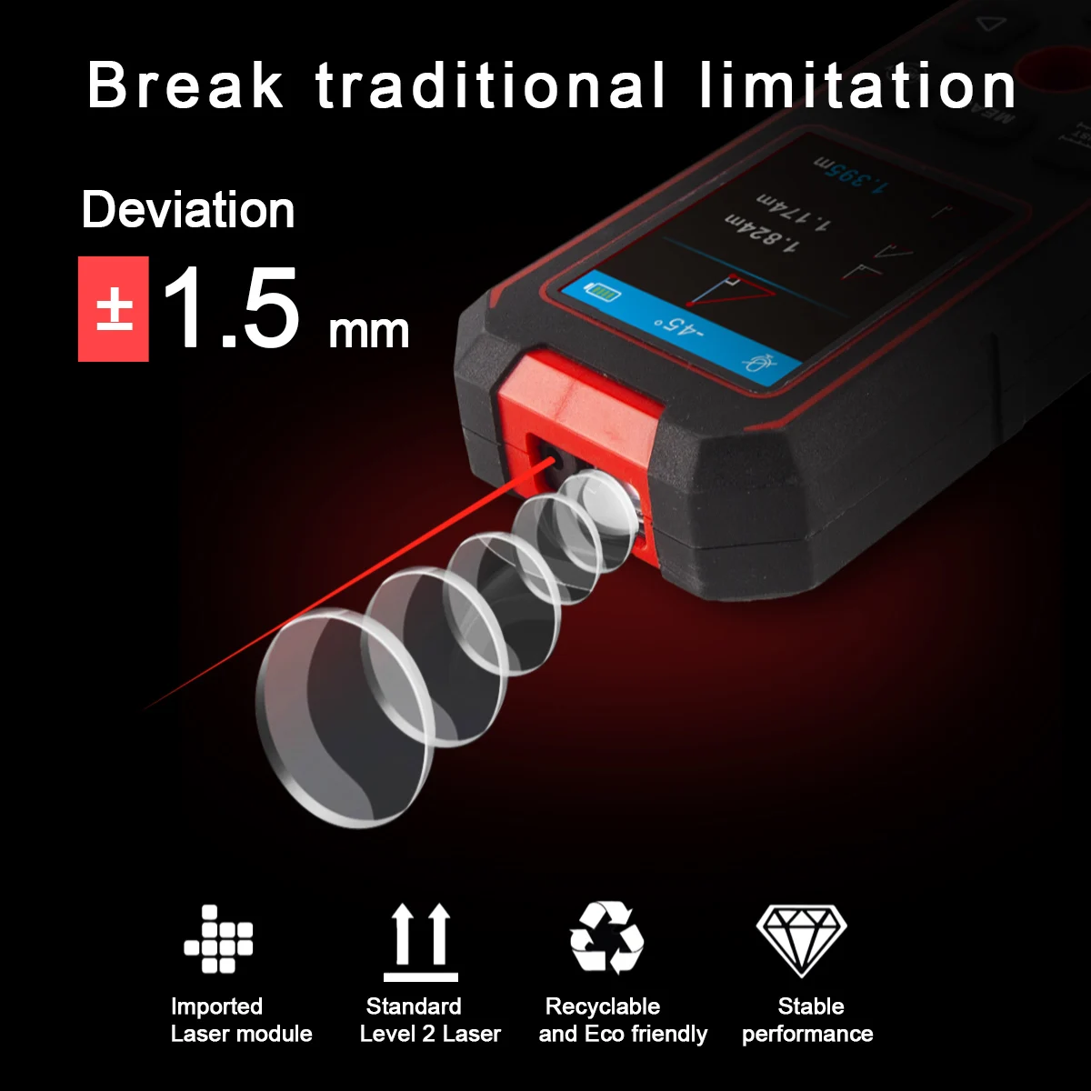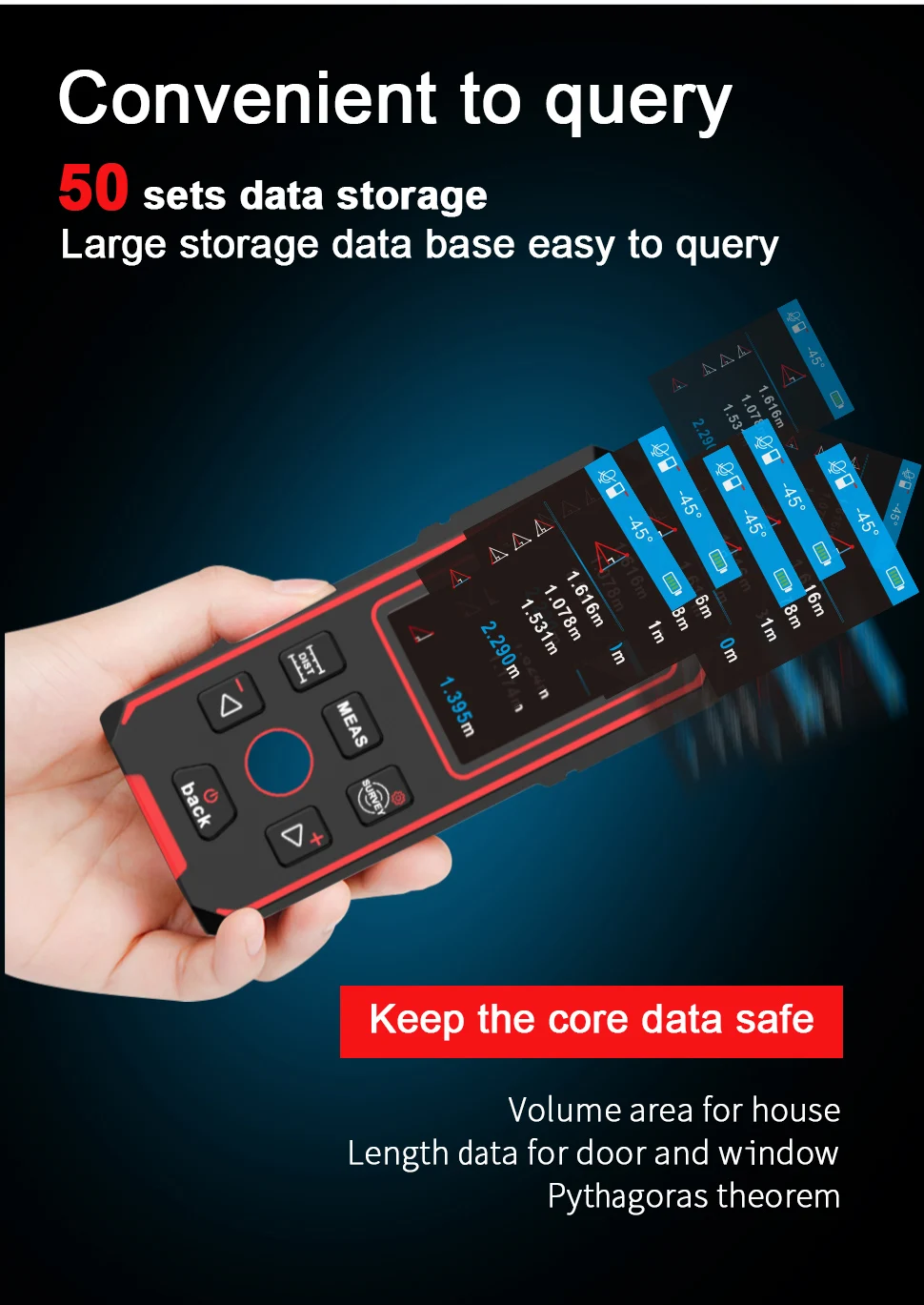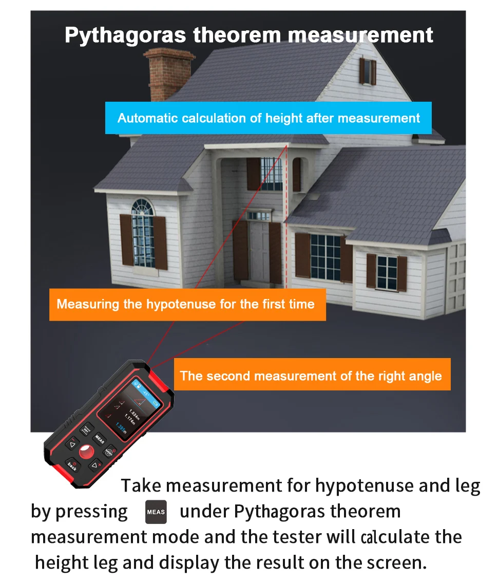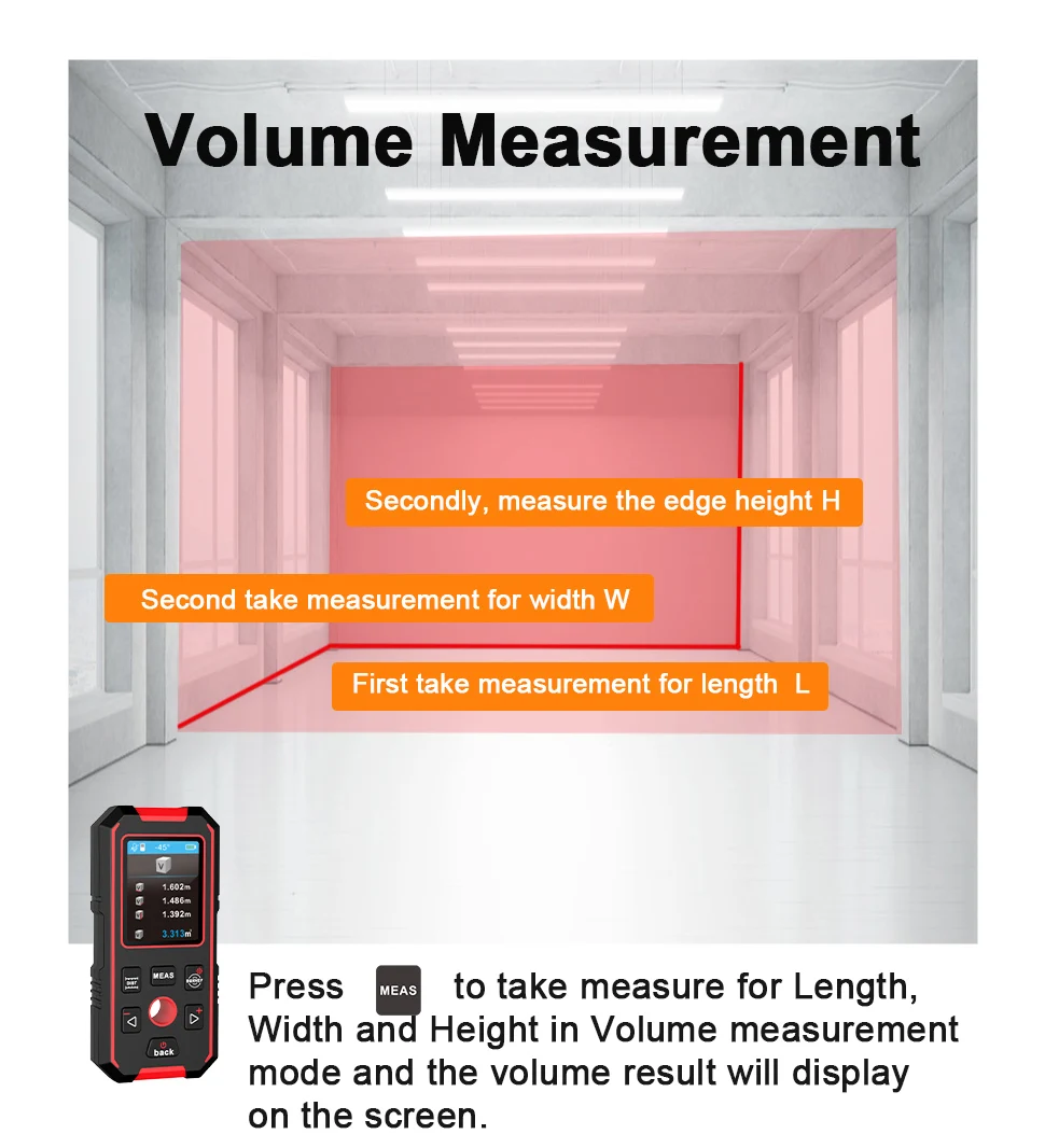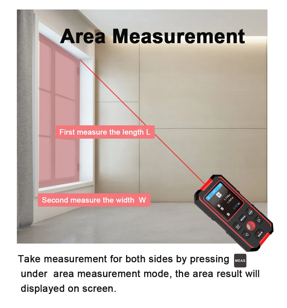 1). It can carry out laser ranging, measure the length, area, volume of the house, perform single or continuous measurement, etc.
