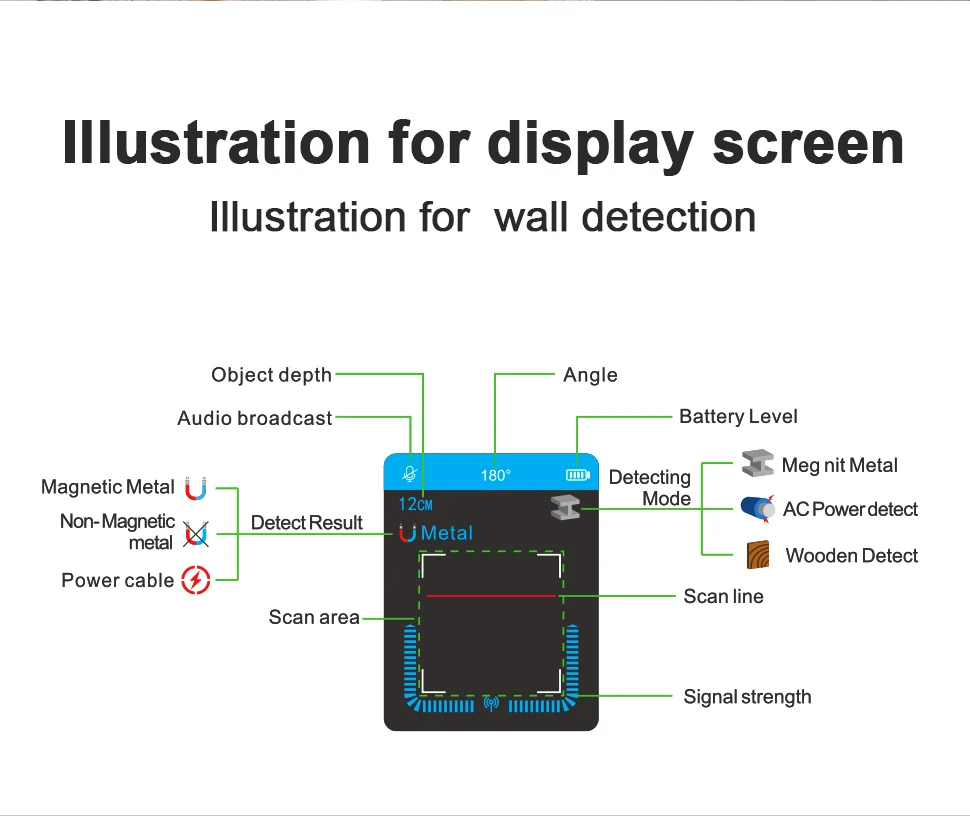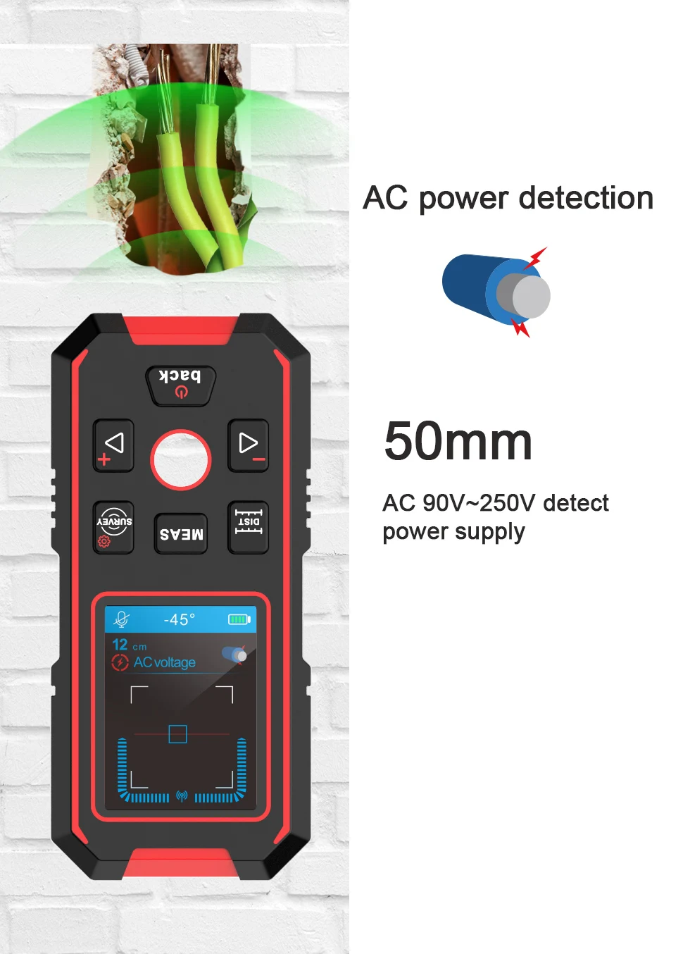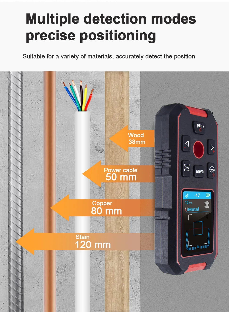 3). Depth measurement: Wood(38mm)/ Live (AC) wire(50mm)/ Non-magnetic metal(100mm)/ Magnetic metal(120mm)