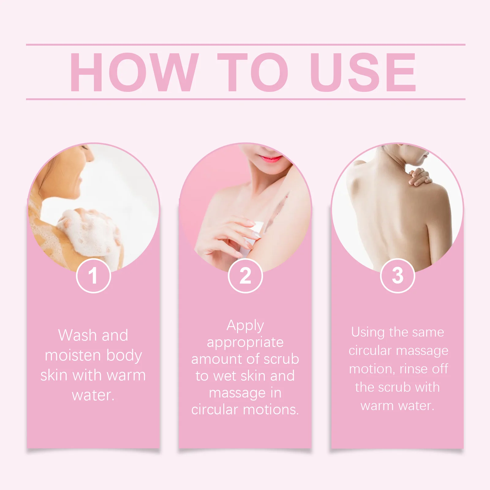 Apply an appropriate amount of scrub to moist skin, gently massage for 1-2 minutes (avoid the eye area and wounds), focus on massaging rough parts such as joints, rinse with water, and use 2-3 times a week for better results.
