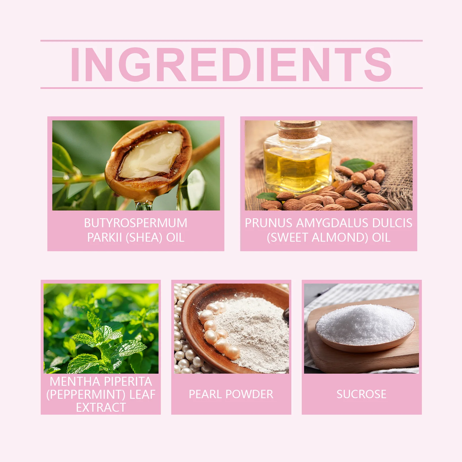 Ingredients: Water, Mineral Oil, Glycerin, Glyceryl Stearate, Carbomer, Triethanolamine, Mint Leaf Oil, Pearl Powder, Sucrose, Shea Butter