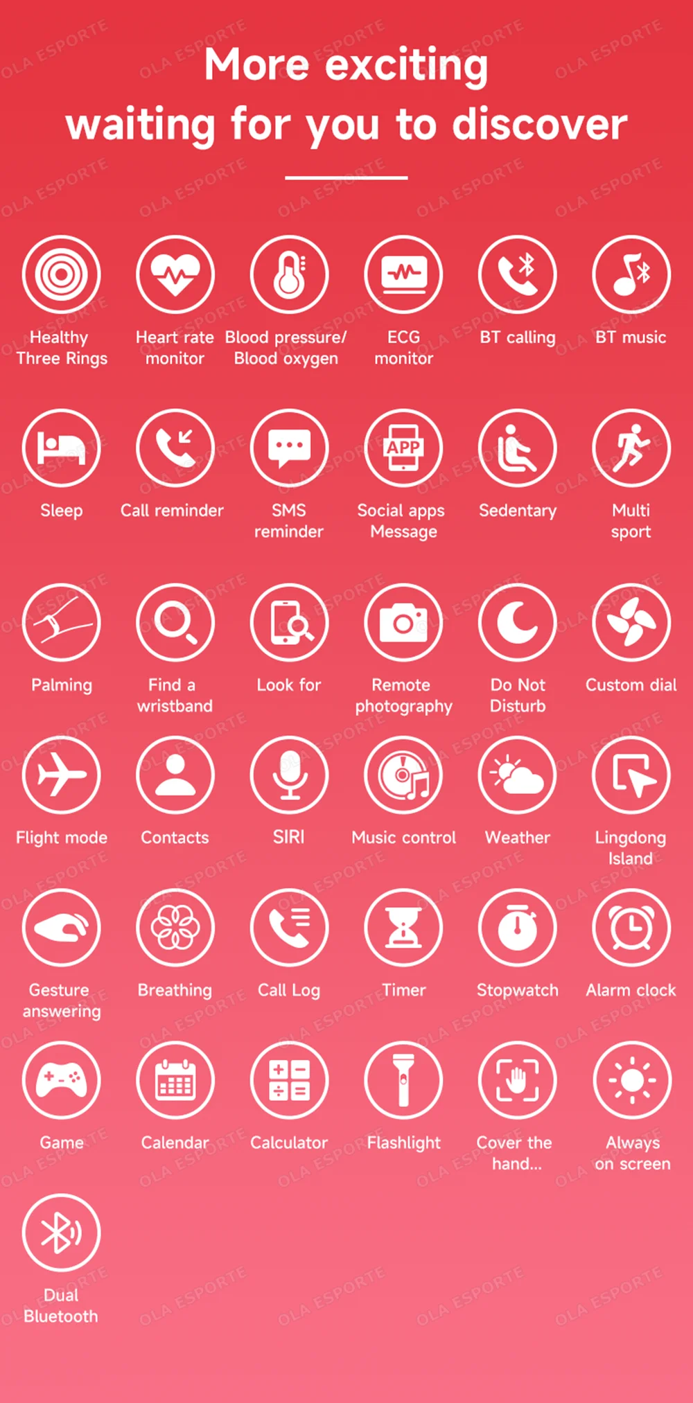 NPC step、distance、Calorie、Heart Rate/Blood Pressure/Oxygen 、BT call、BT Music、Temperature、Monitoring、Sleep monitoring、call reminder、SMS Alerts、Social APP Message Reminder、Alarm clock reminder、A sedentary reminder、sport、Turn the wrist and shine the screen、Looking for bracelets、Looking for Phones、Remote Photography、Rejection of calls、Do Not Disturb、Multi-dial switching