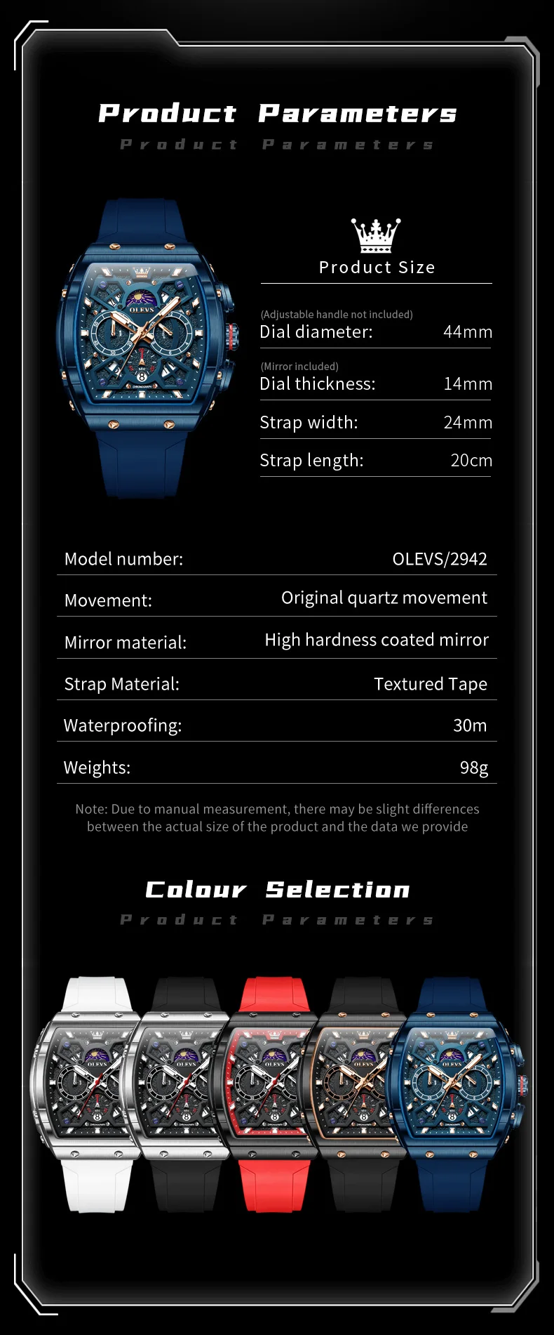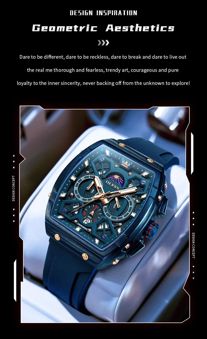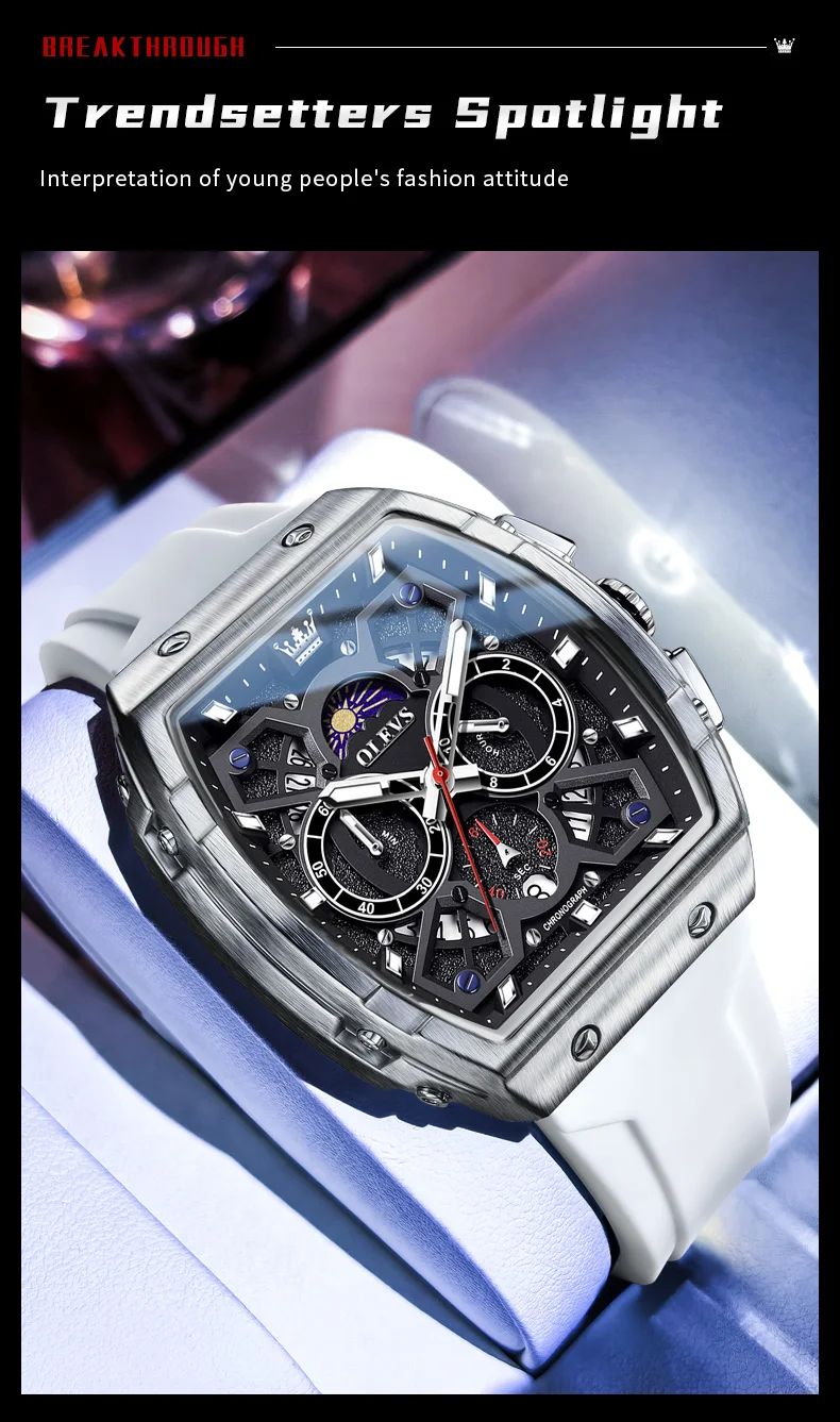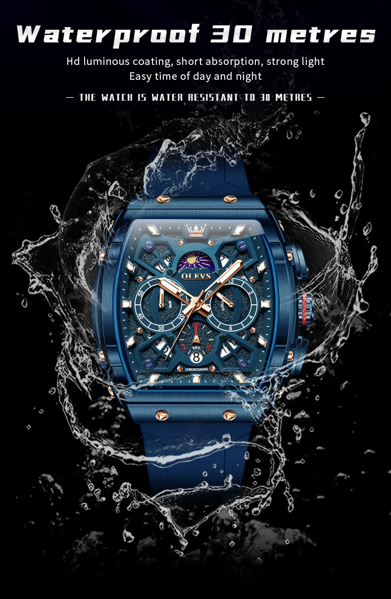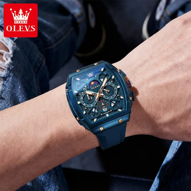 OLEVS 2942 Mens Watch Silicone Strap Moon Phase Tonneau Quartz Watch Waterproof Luminous Sports Date