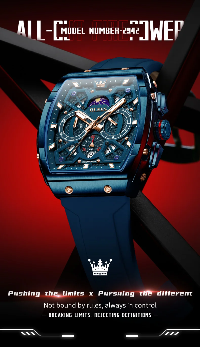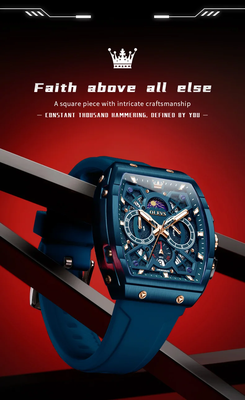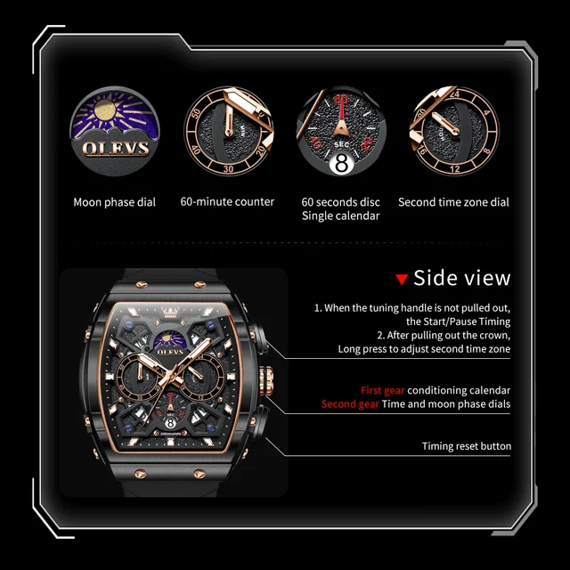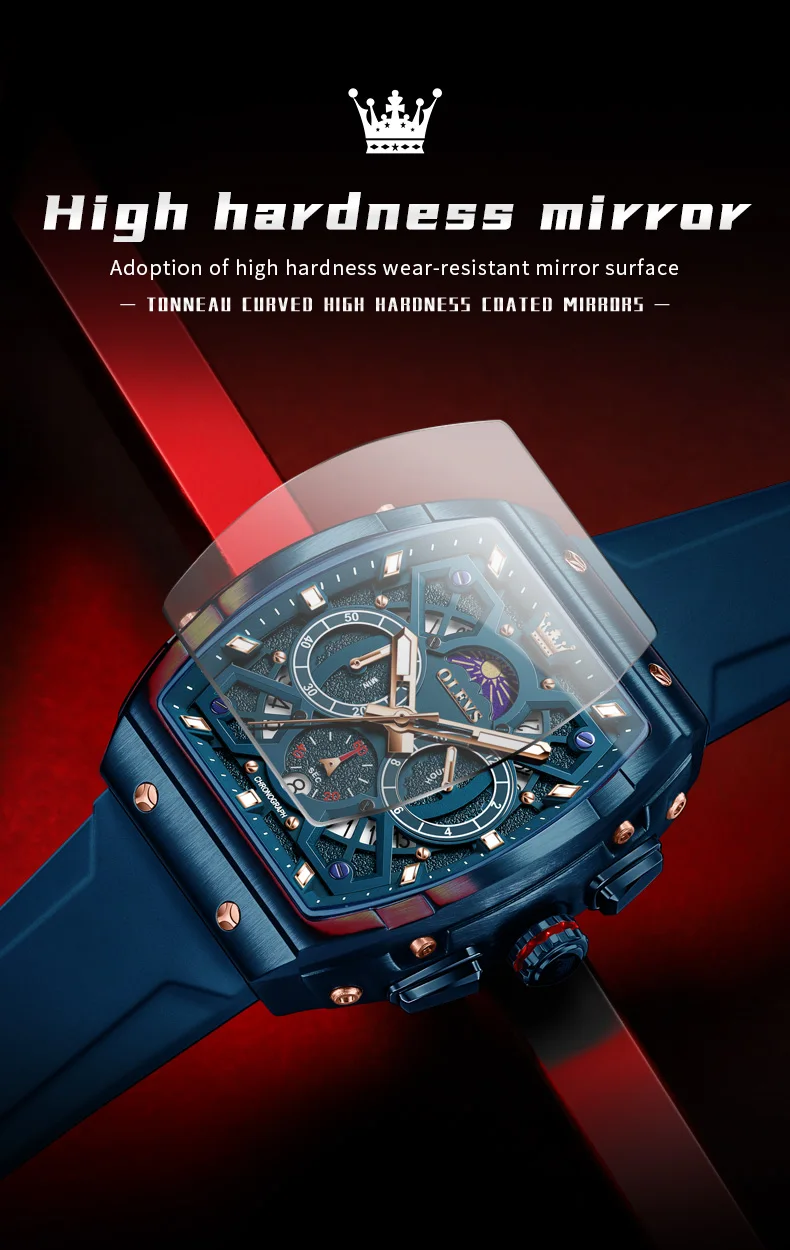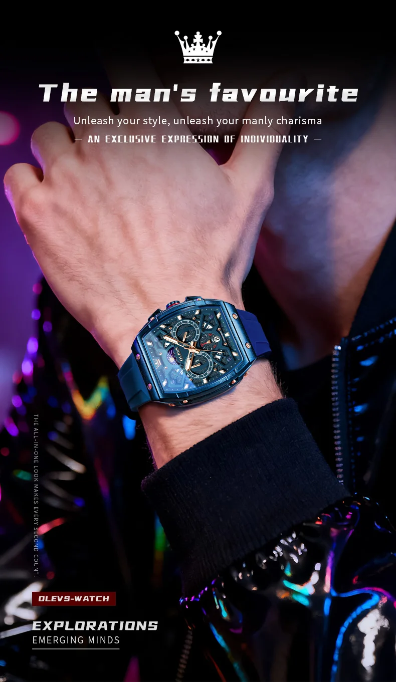 OLEVS 2942 Mens Watch Silicone Strap Moon Phase Tonneau Quartz Watch Waterproof Luminous Sports Date