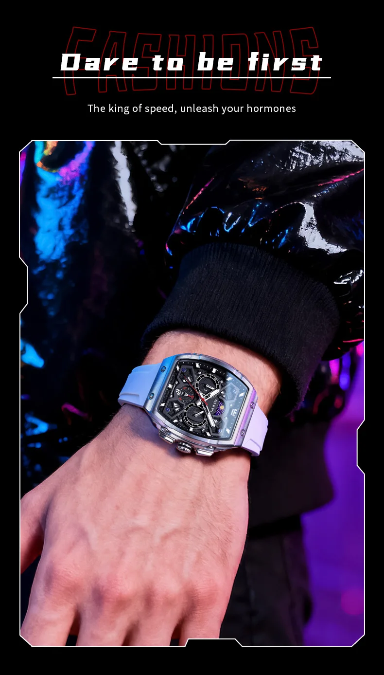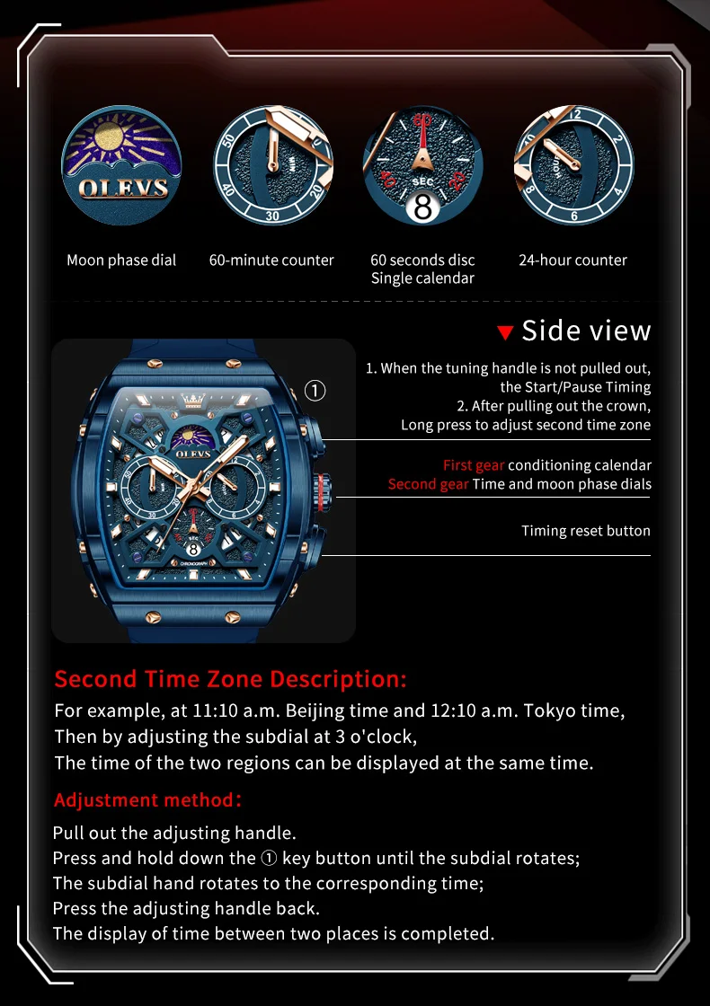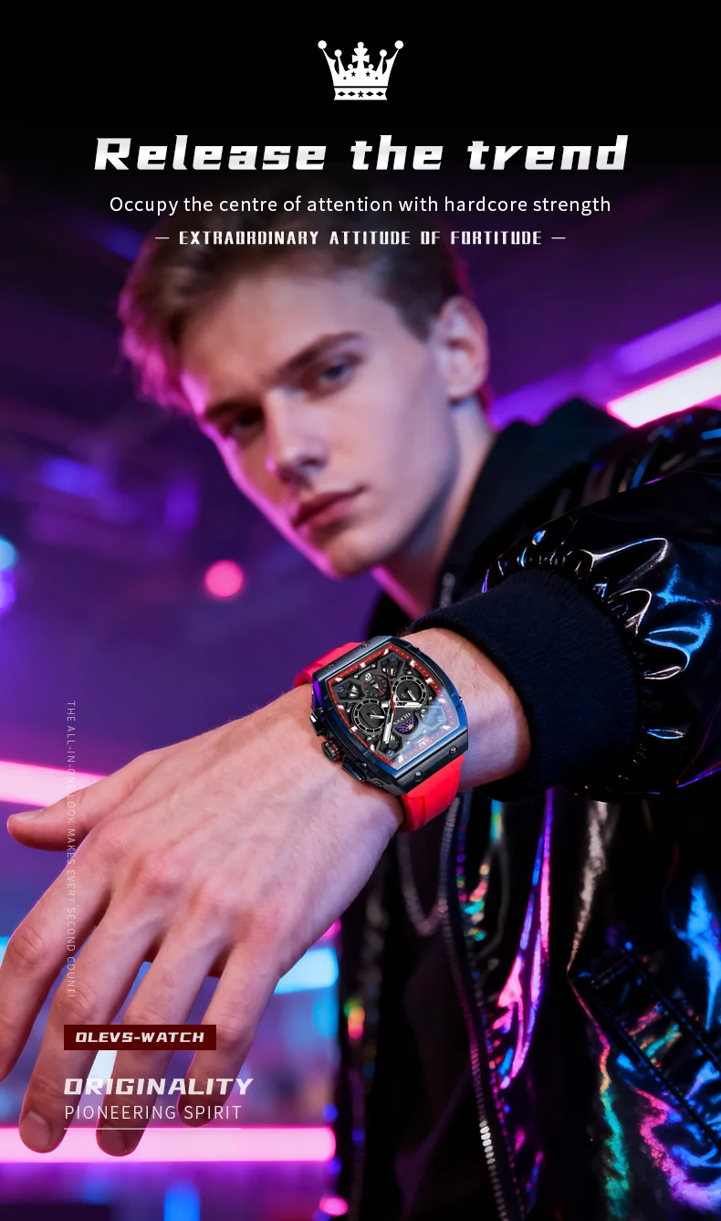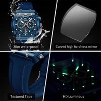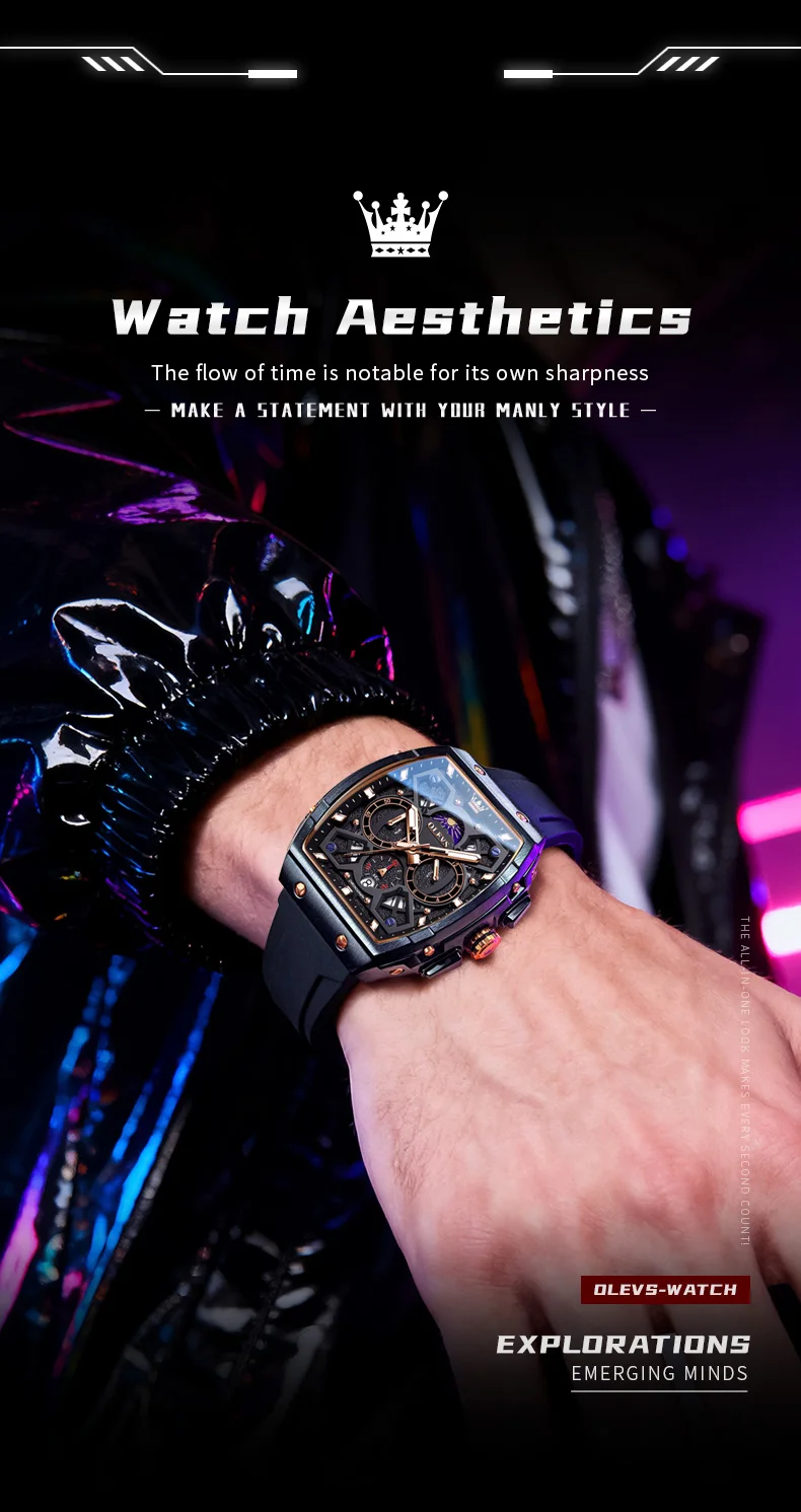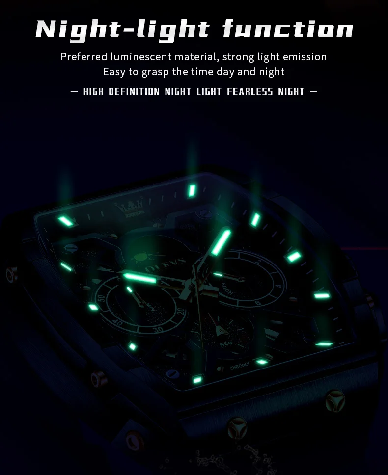 OLEVS 2942 Mens Watch Silicone Strap Moon Phase Tonneau Quartz Watch Waterproof Luminous Sports Date