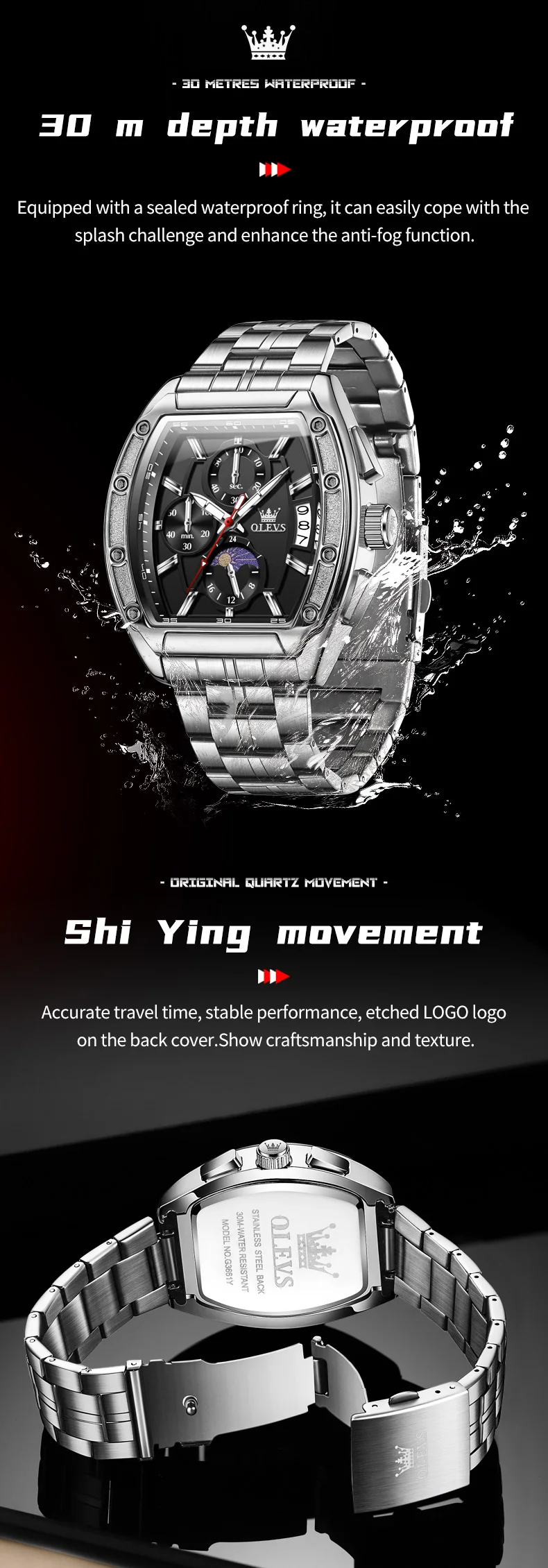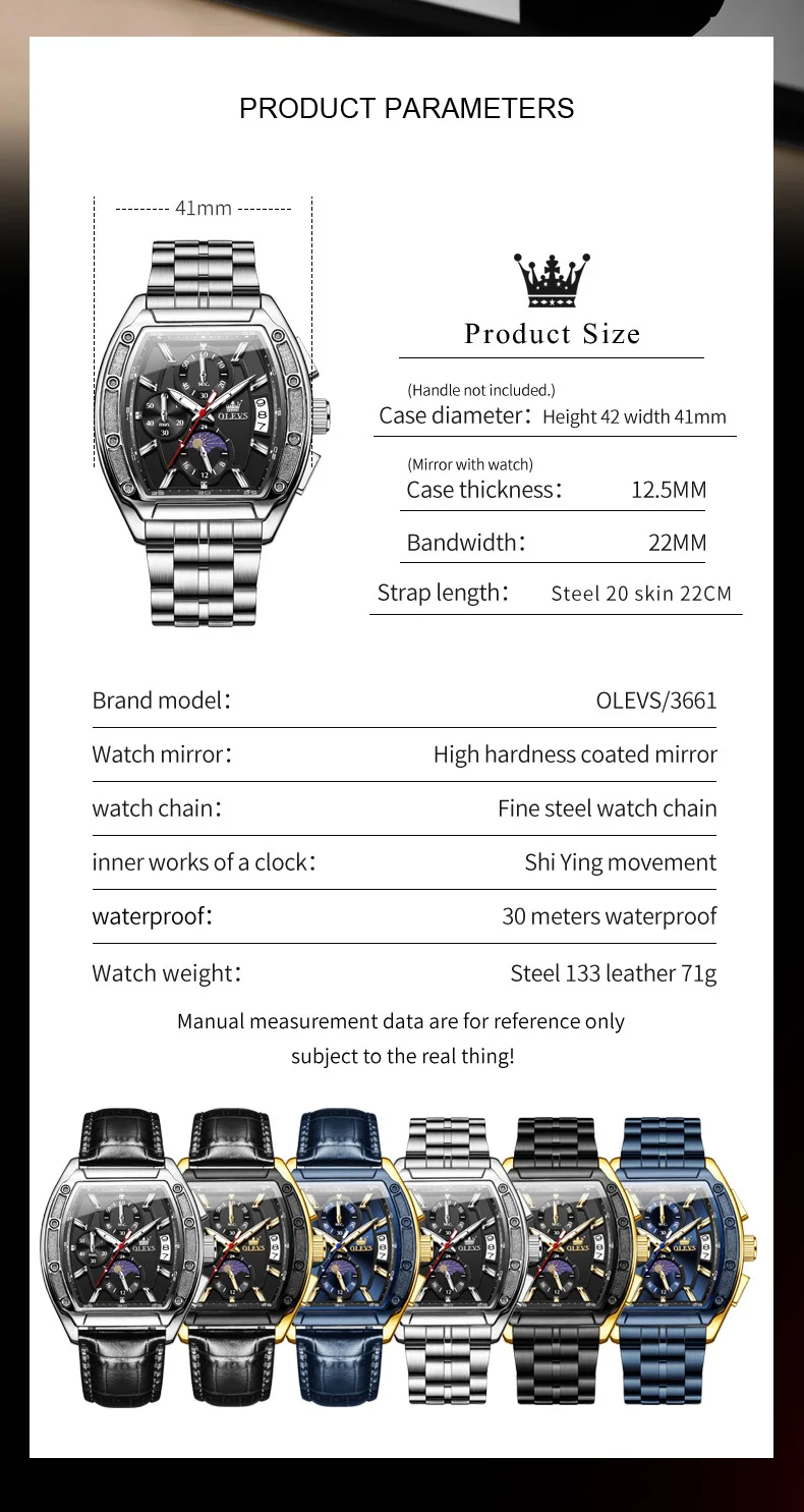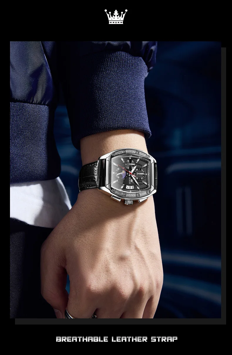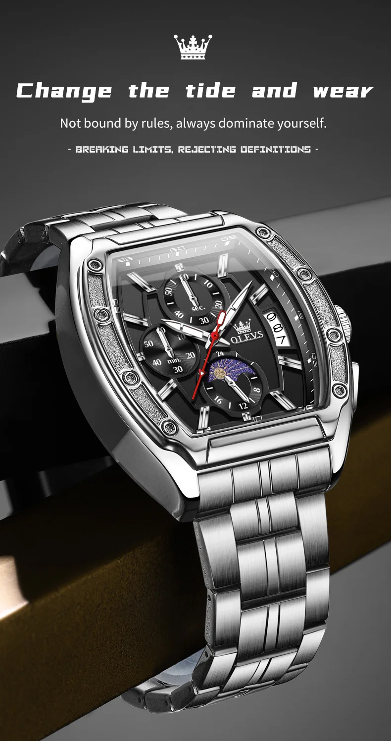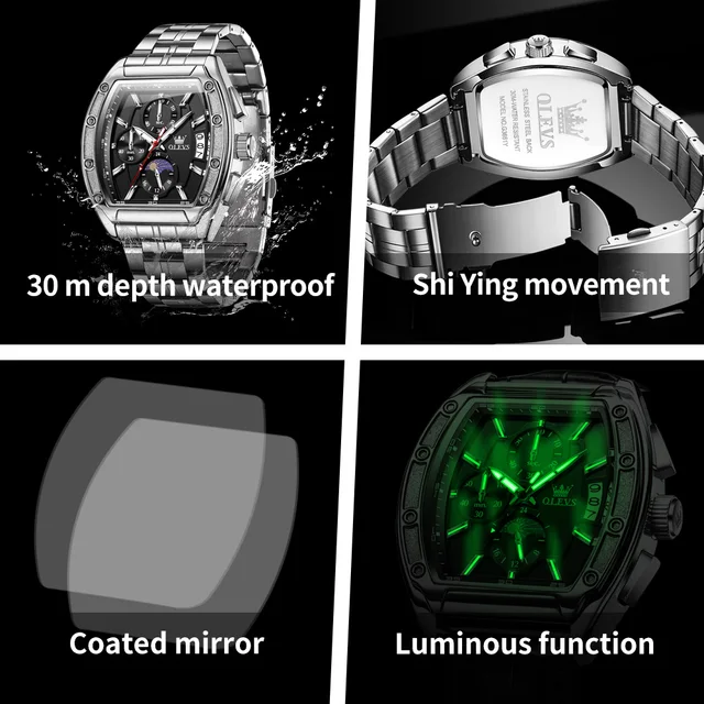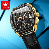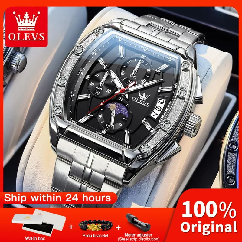 OLEVS 3661 Mens Watch Original Tonneau Quartz Watch Multifunctional Chronograph Waterproof Moon Phase