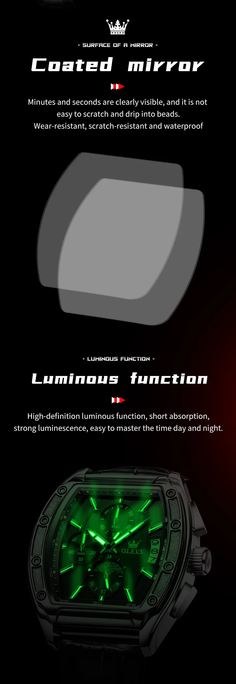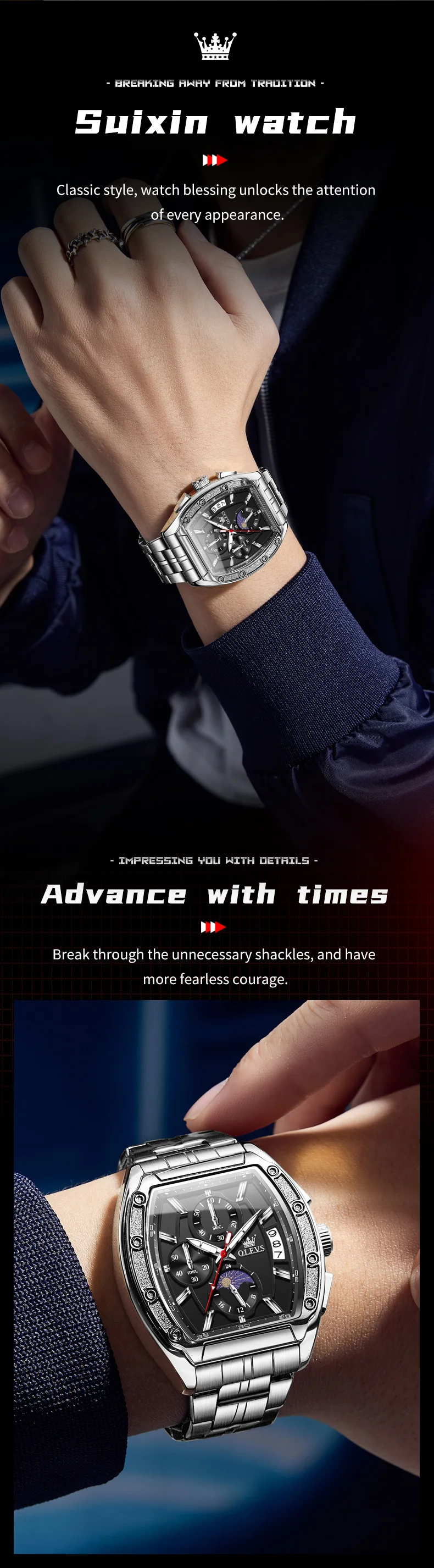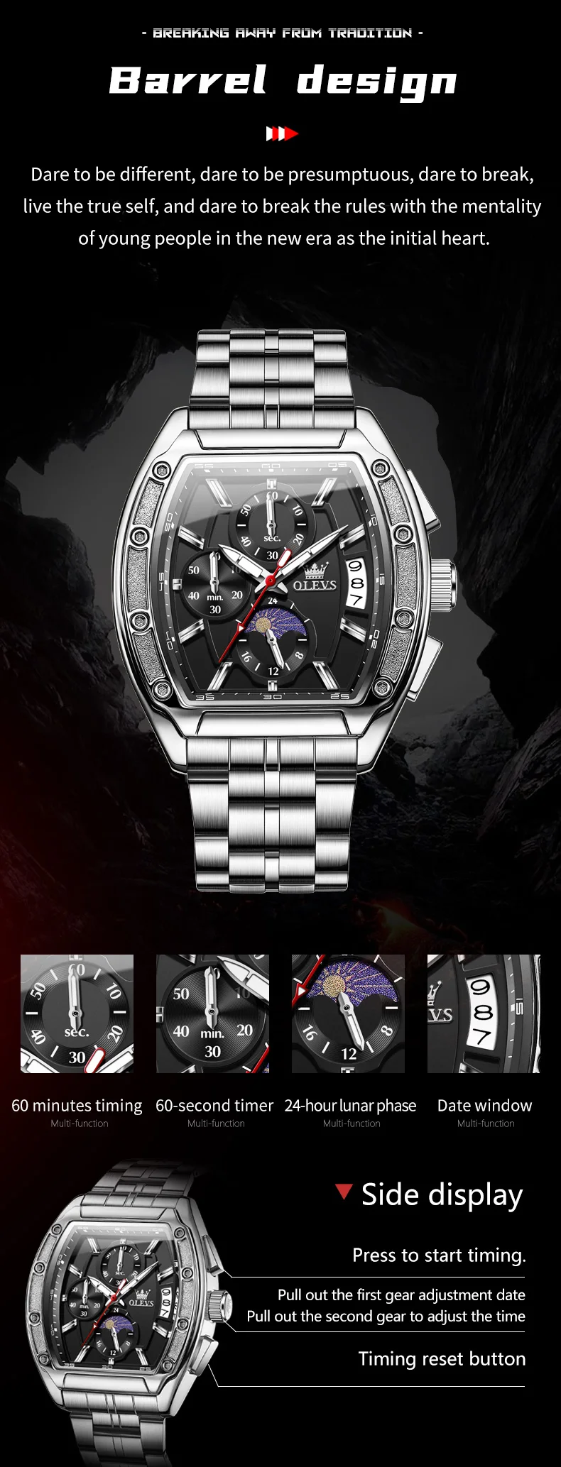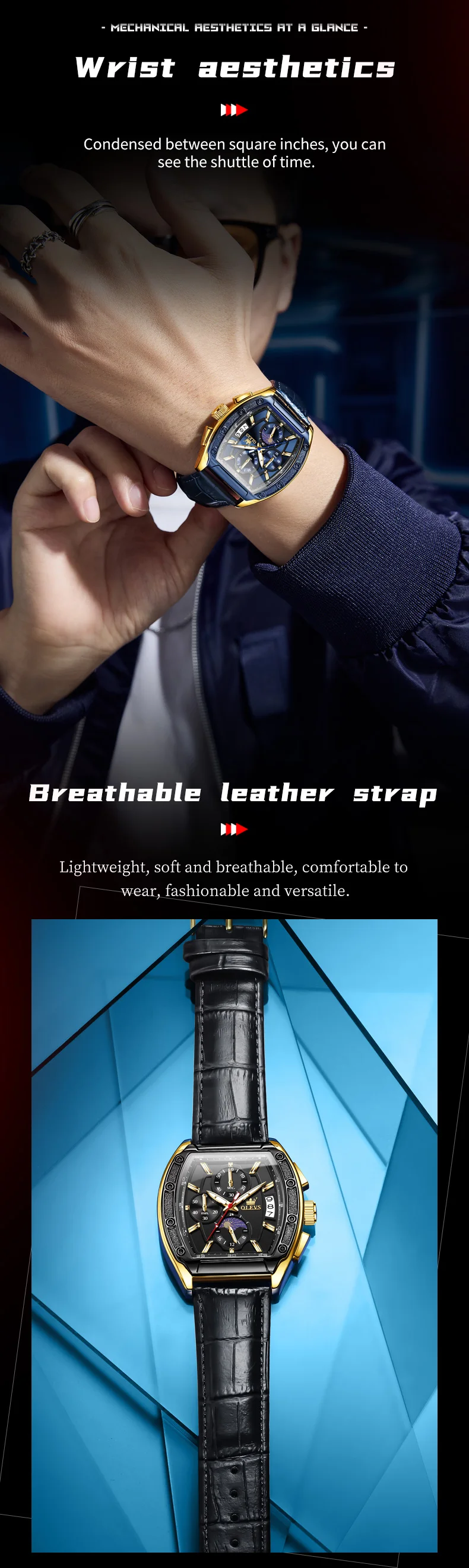 OLEVS 3661 Mens Watch Original Tonneau Quartz Watch Multifunctional Chronograph Waterproof Moon Phase