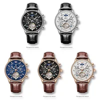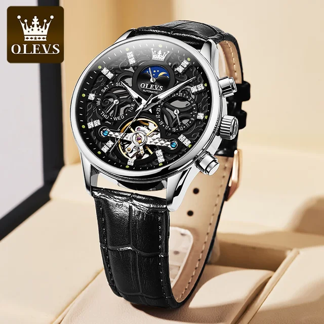 OLEVS 6658 Mens Watch Original Skeleton Multifunctional Chronograph Mechanical Watch Leather Strap Watches
