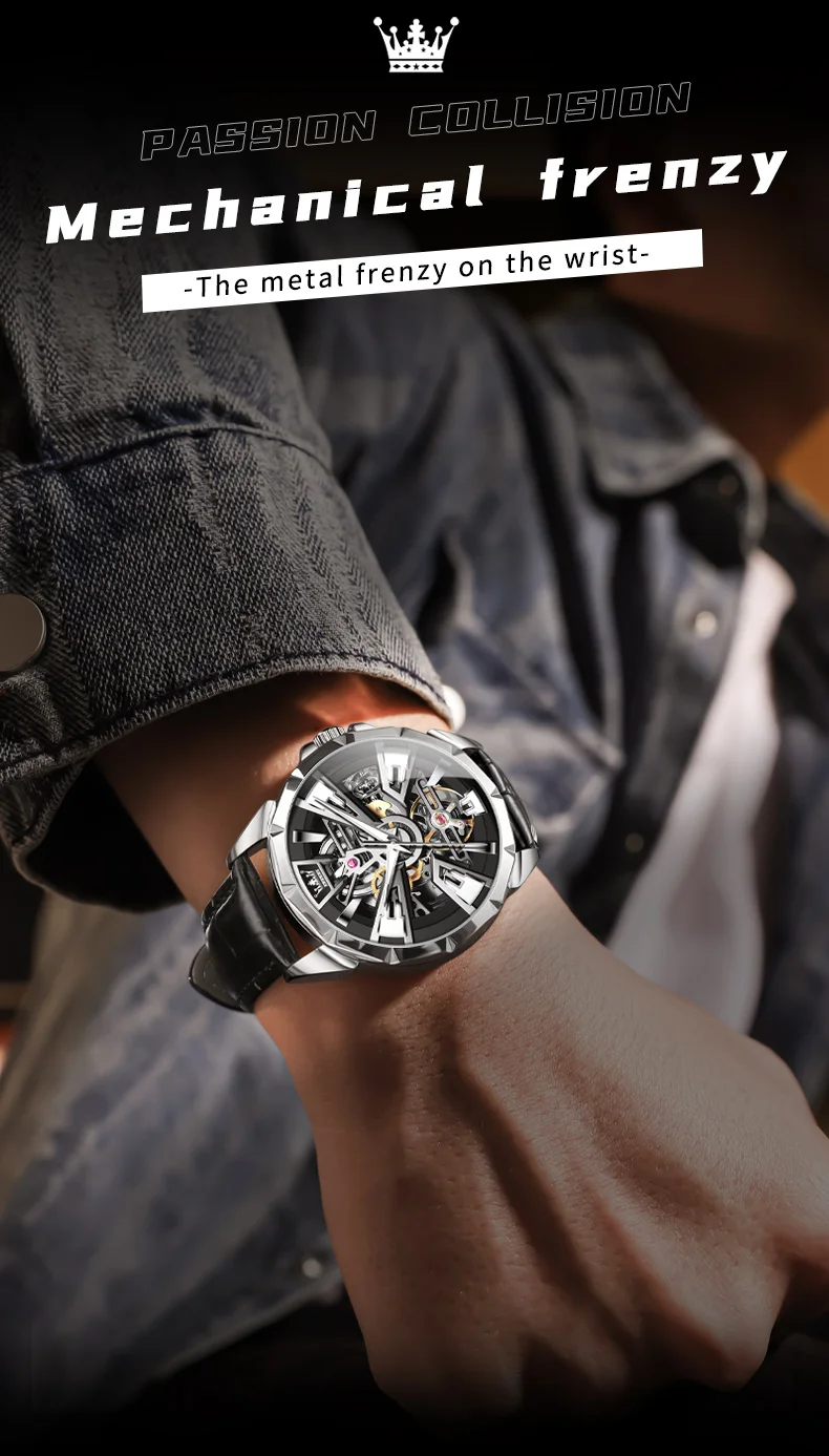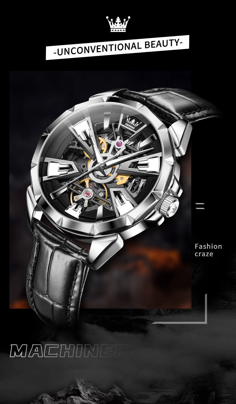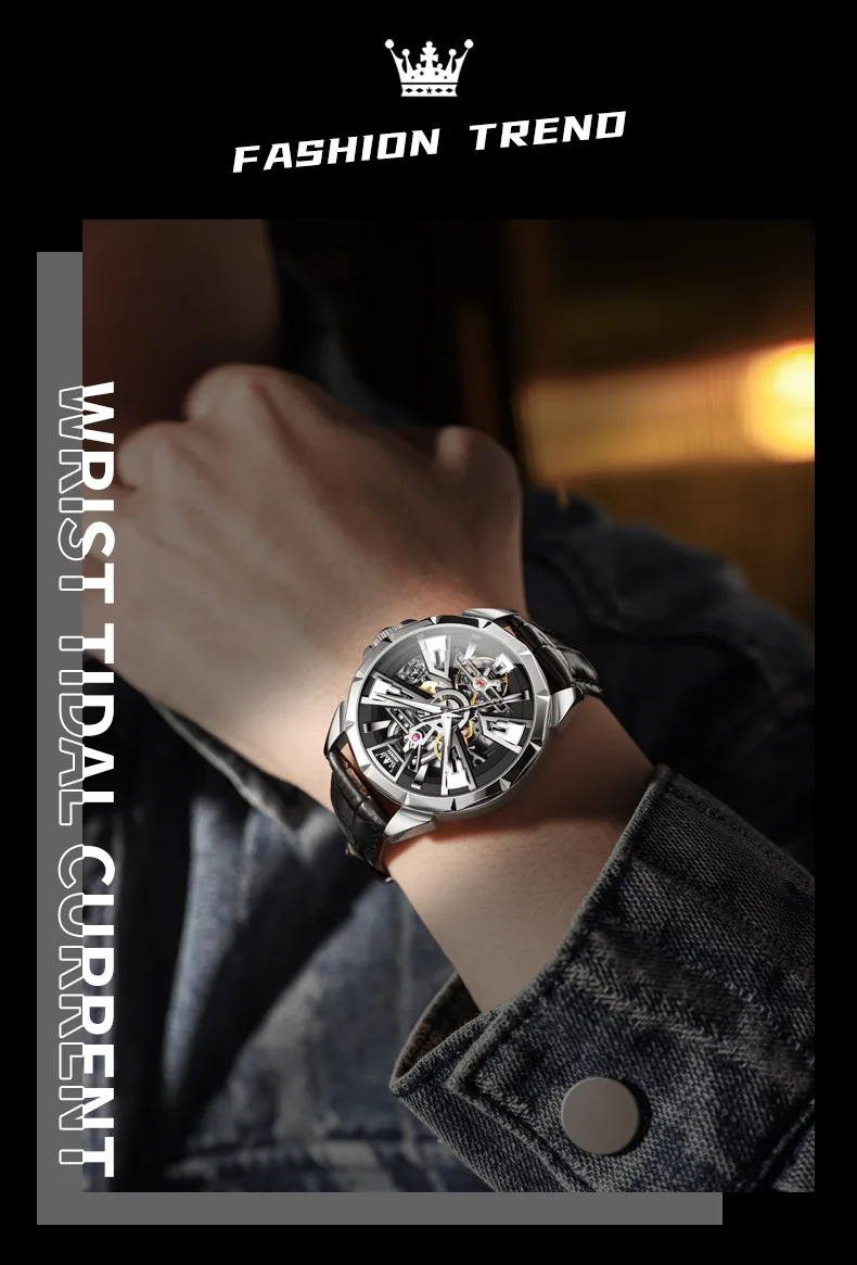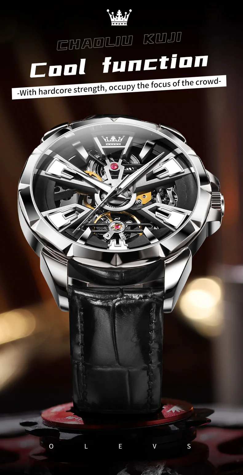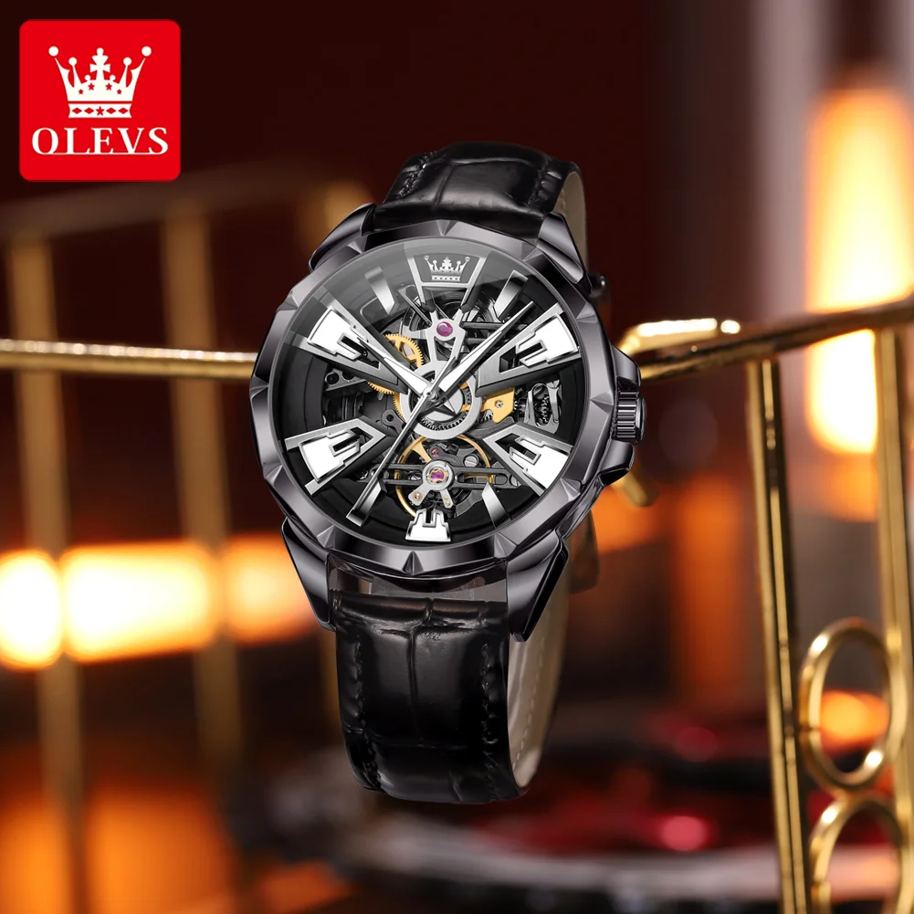 OLEVS 7051 Fashion Men’s Watch Leather Strap 30M waterproof Hollow HD Luminous Automatic Mechanical