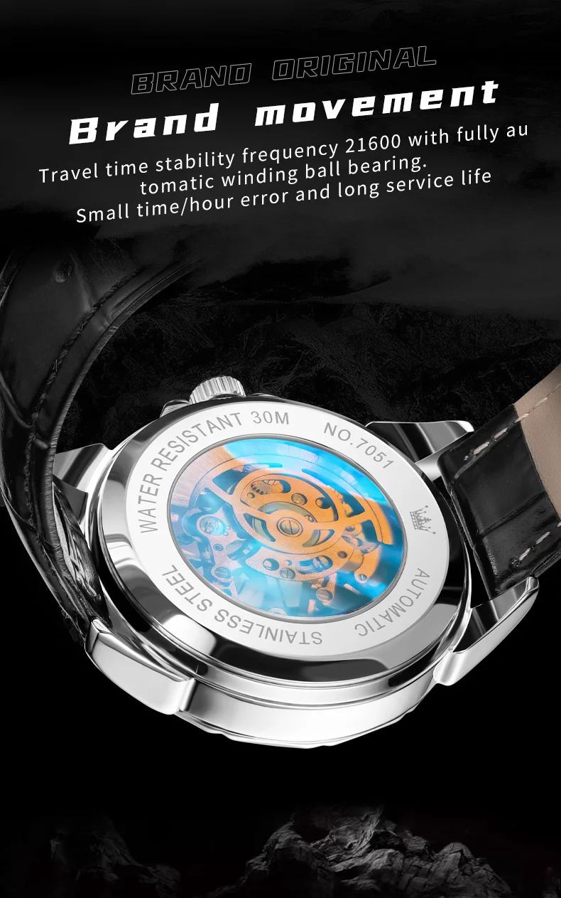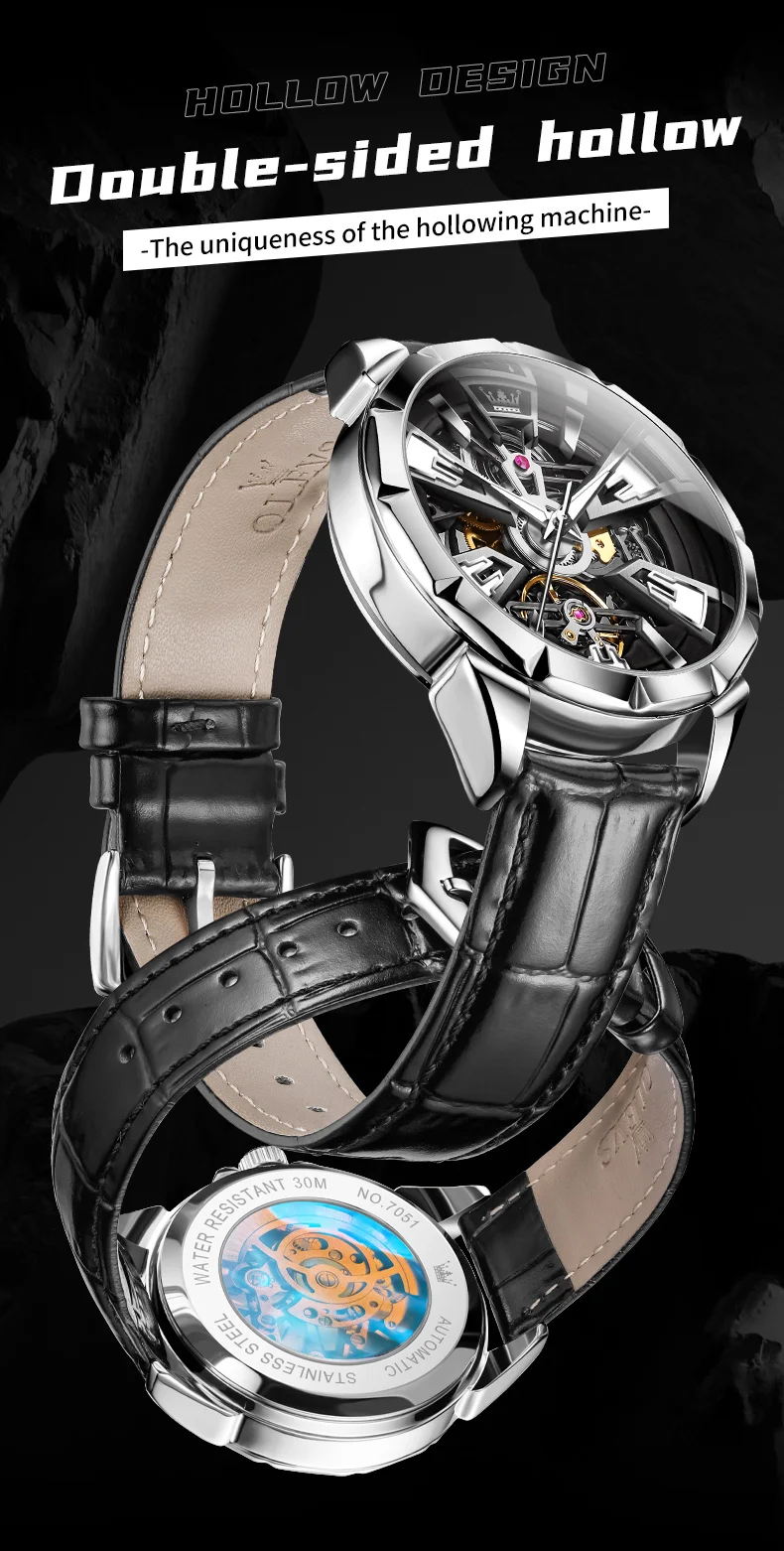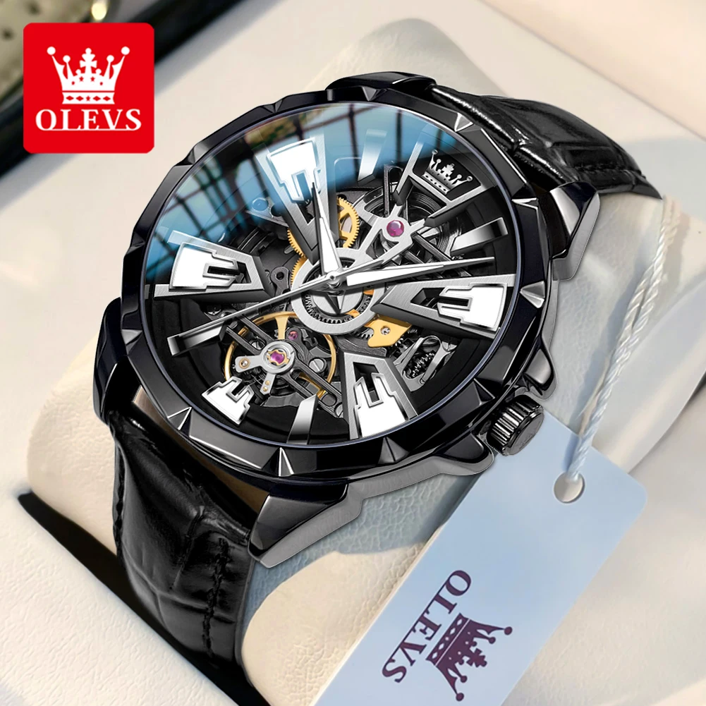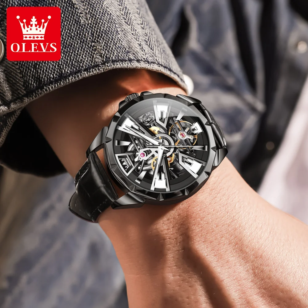 OLEVS 7051 Fashion Men's Watch Leather Strap 30M waterproof Hollow HD Luminous Automatic Mechanical Wristwatch for Men