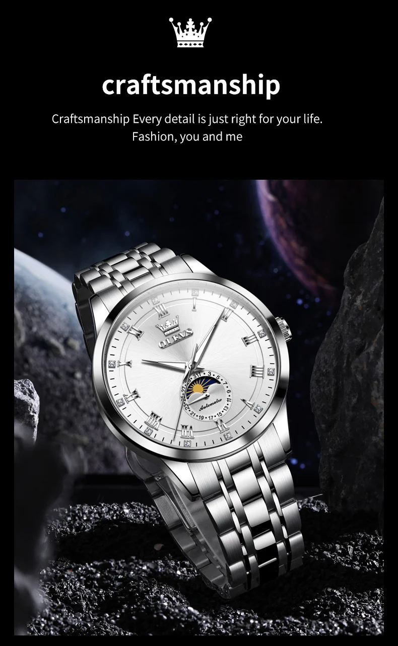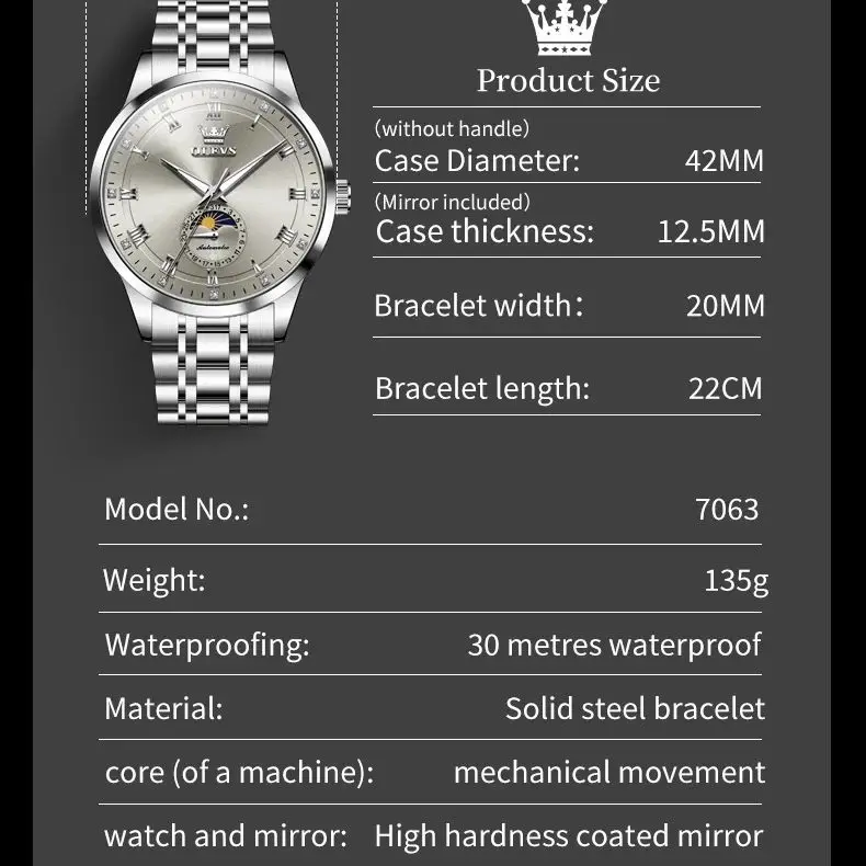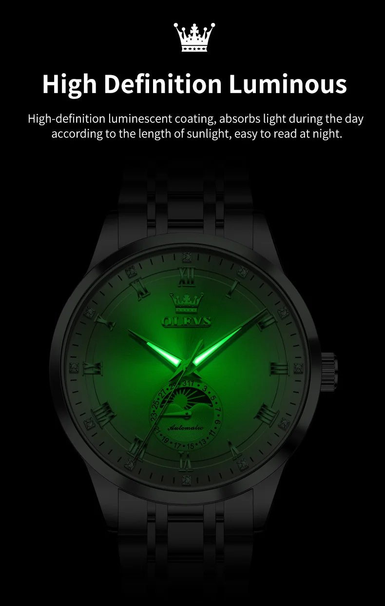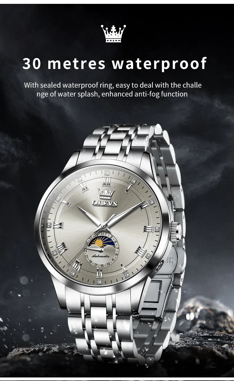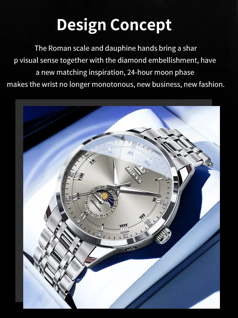 OLEVS 7063 Luxury Men Original Fully Automatic Mechanical Watch Fashion Luminous Moon Phase Waterproof Clock Business Men Watch