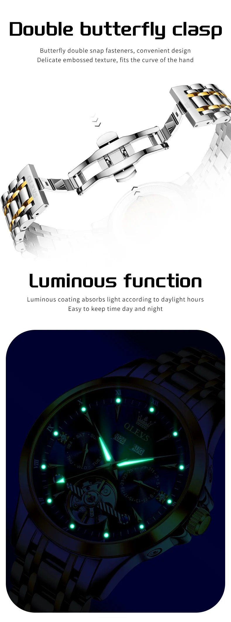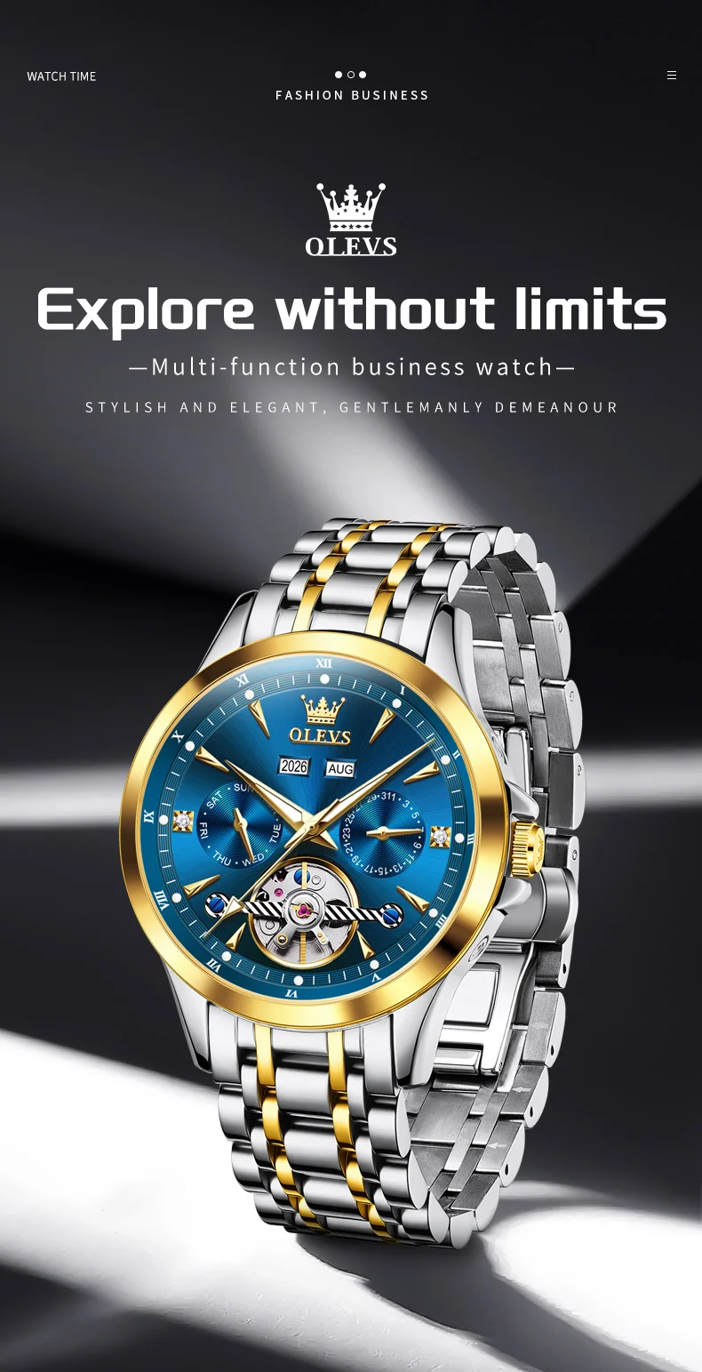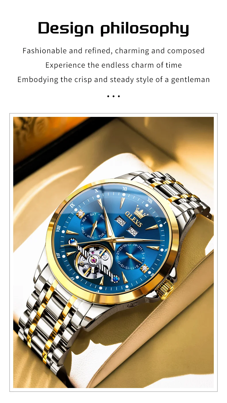 OLEVS 7091 Mens Watch Flywheel Automatic Mechanical Watch Stainless Steel Date Year Month Mens Gifts