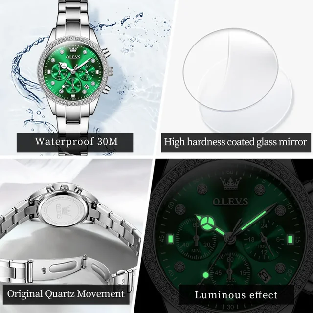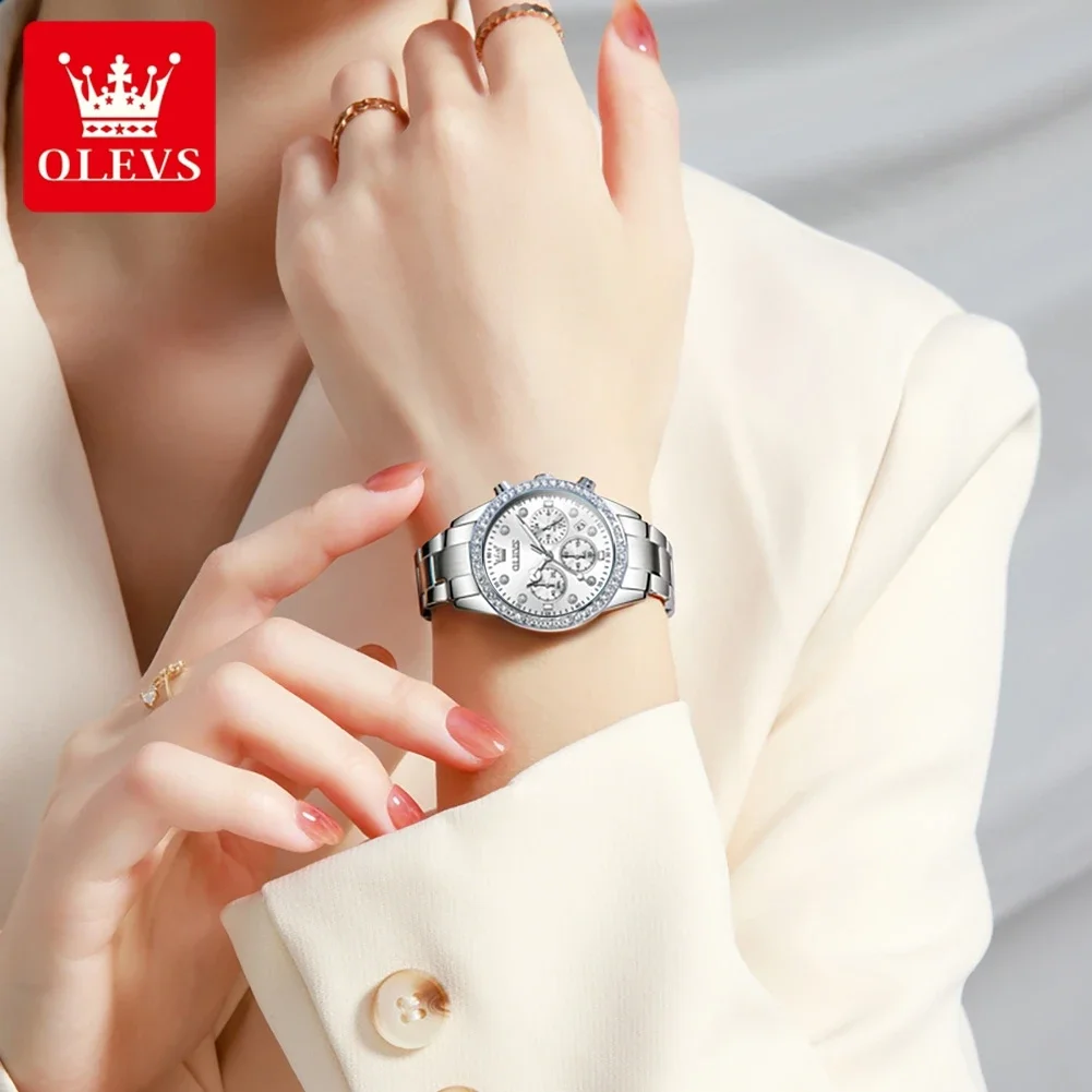 OLEVS Women's Watches Top Brand Luxury Original Quartz Watch for Ladies Chronograph Waterproof Luminous Rhinestone Dial 24 Hour