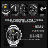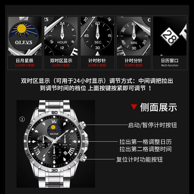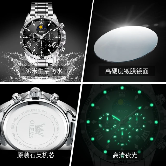 OLEVS Men's Watches Classic Multifunctional Fltwheel Chronograph Original Quartz Wristwatch Moon Phase 24 Hour Waterproof reloj