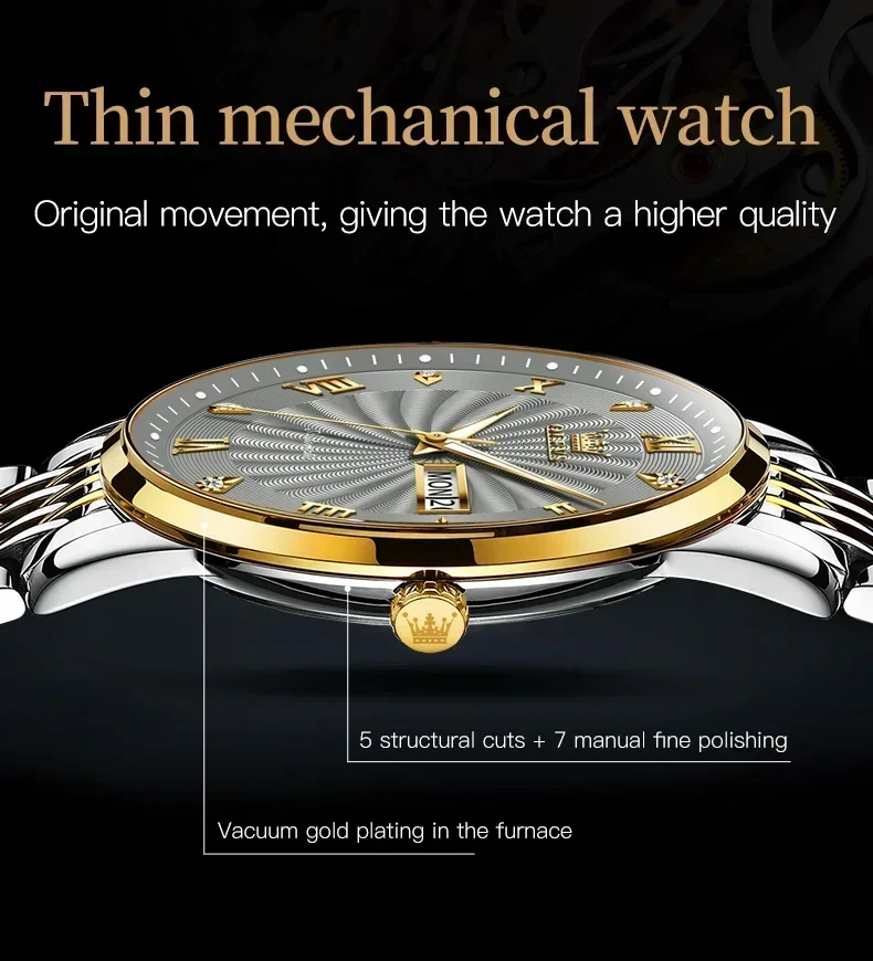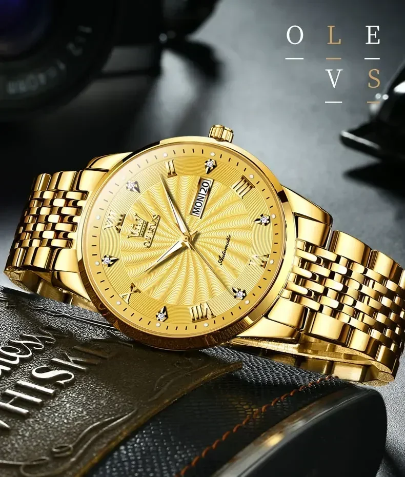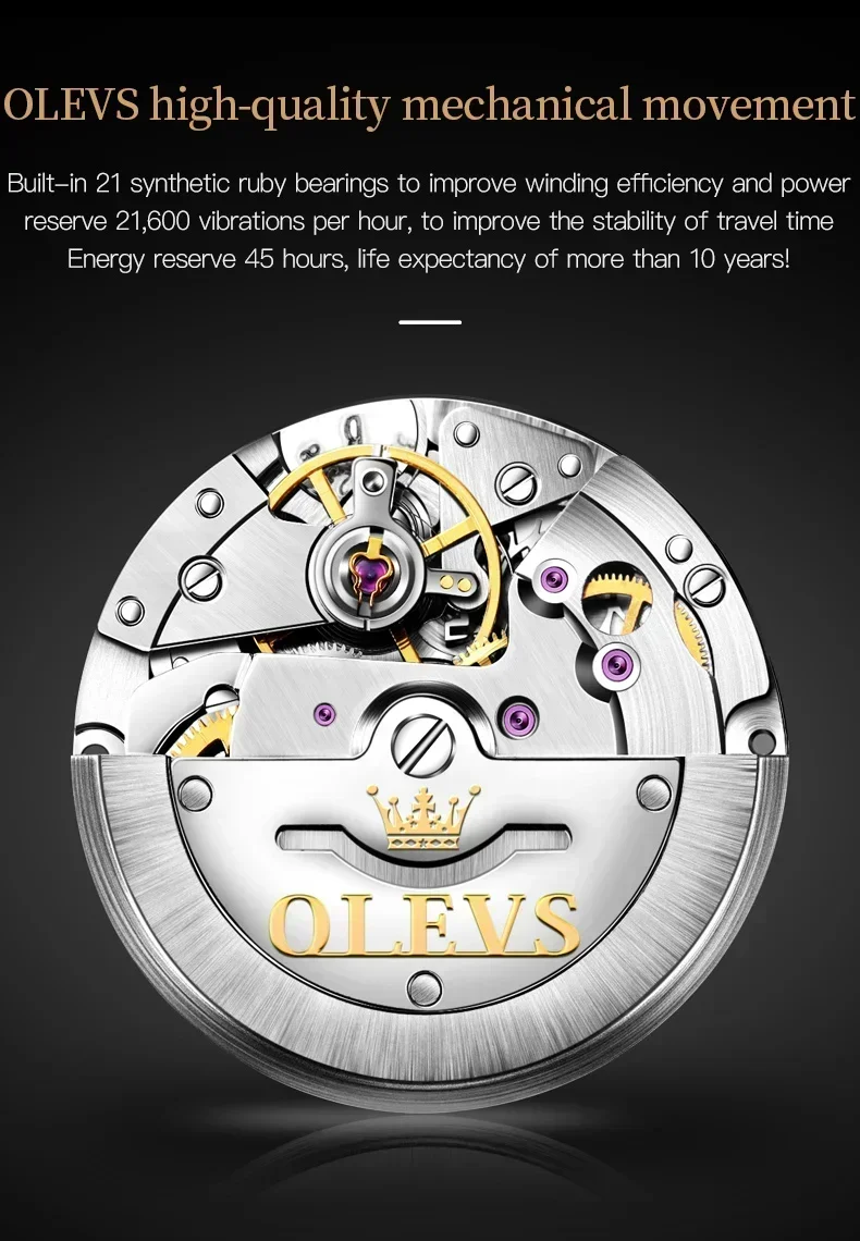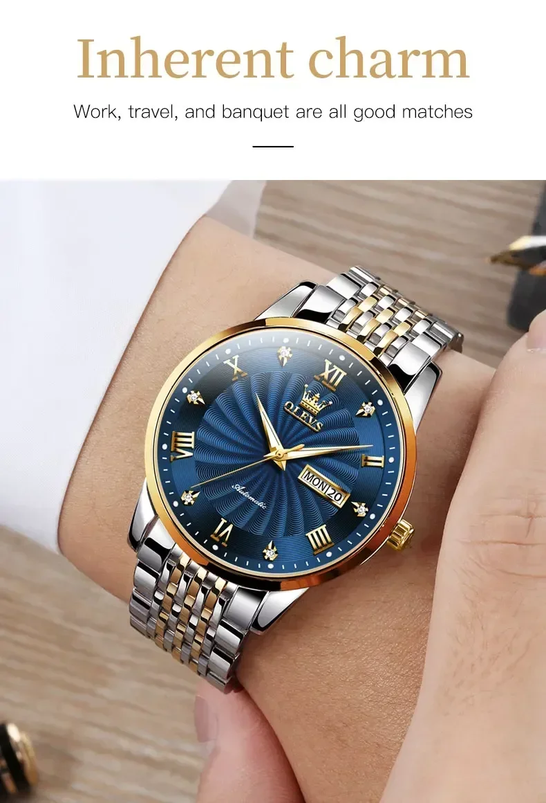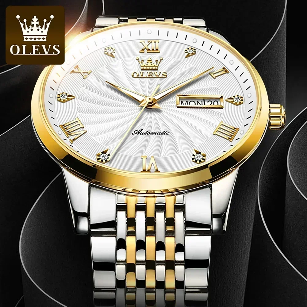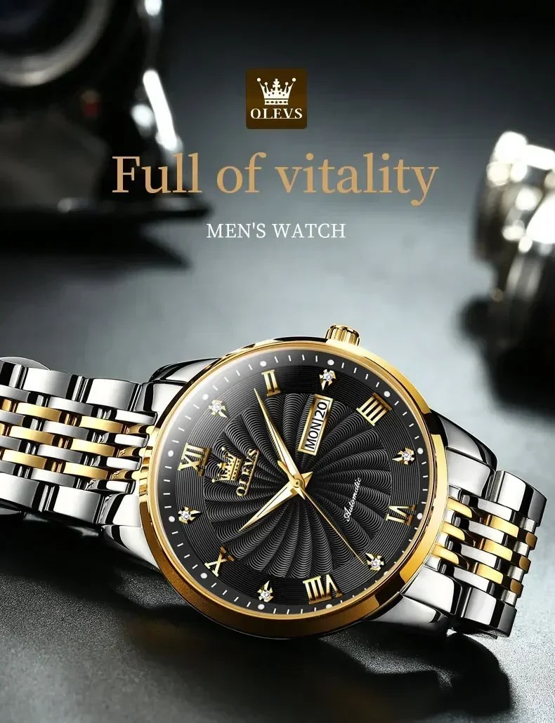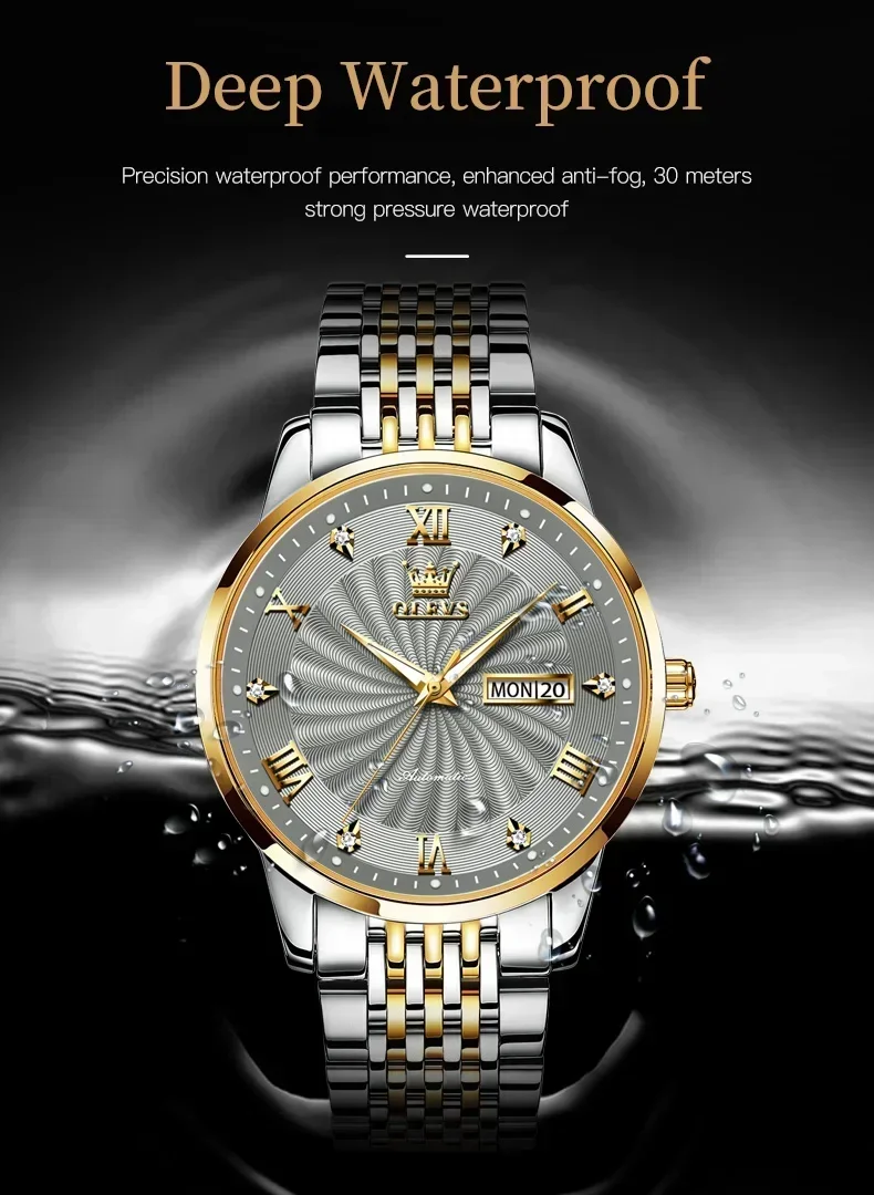 OLEVS Top Brand Automatic Mechanical Man Watch Threaded Dial Date Waterproof Stainless Steel Strap Luxury
