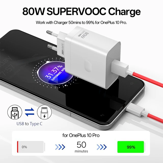 🙂 Oneplus 80W USB wall charger with an original 1M USB C cable, designed to allow charging for Super vooc/SUPERDART devices for Oneplus/OPPO/Realme.